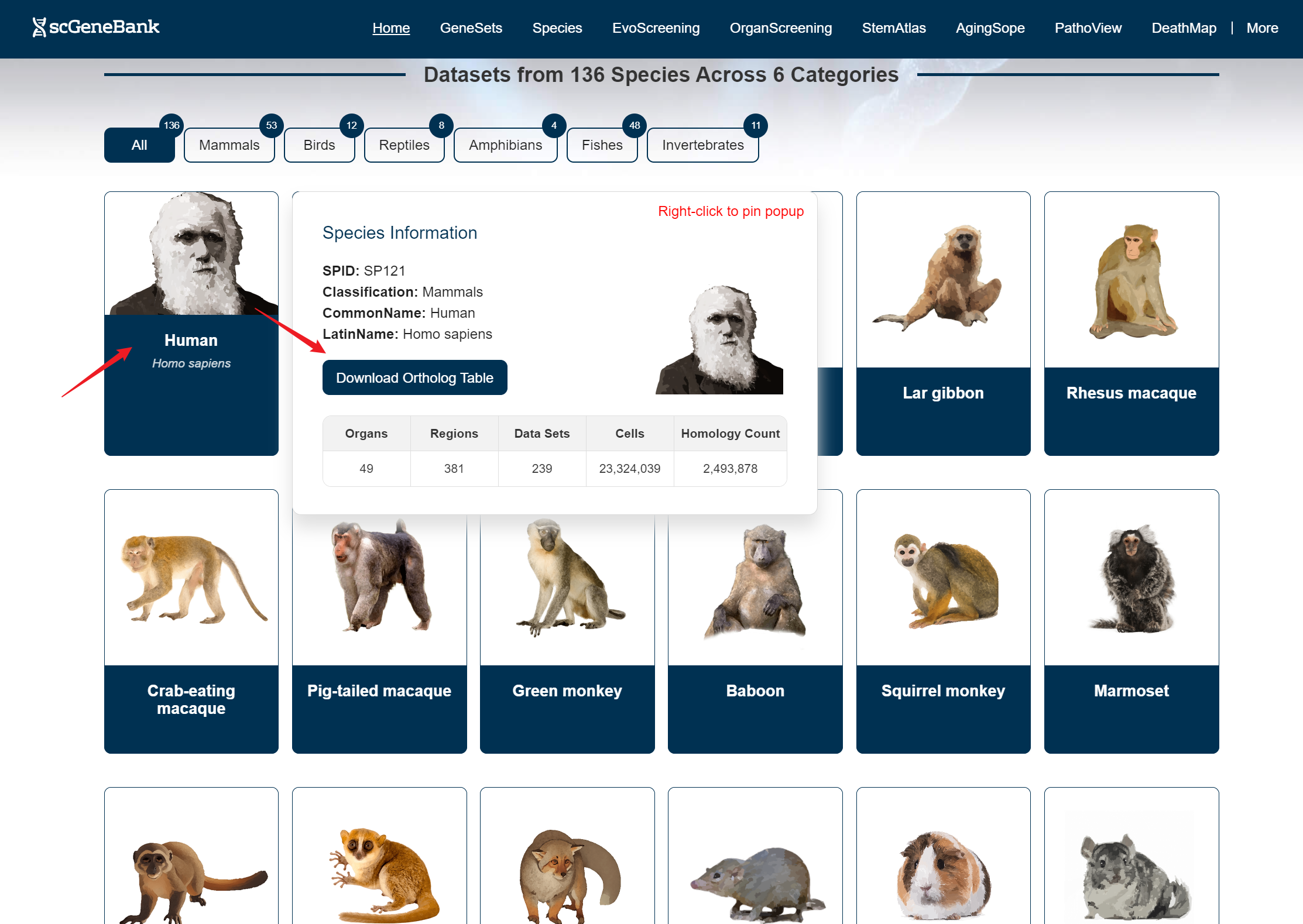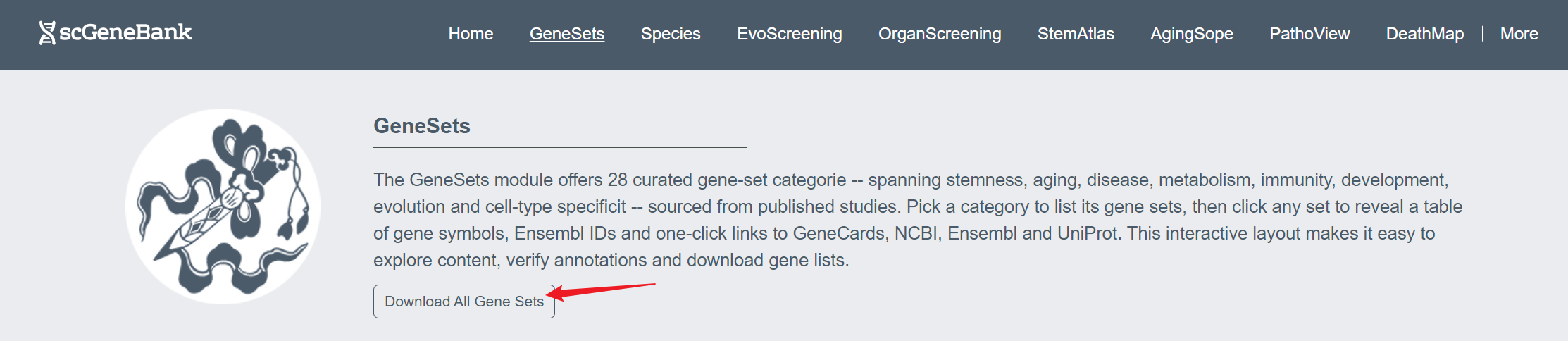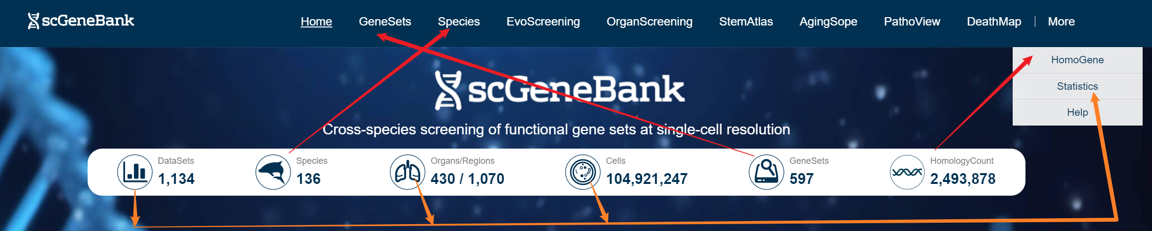 scGeneBank provides as a useful platform to explore functional gene sets across species. scGeneBank integrated 1,134 single-cell datasets, covering 136 species, 430 organs/1,070 regions, containing 104,921,247 cells, and systematically annotated 597 gene sets for 28 functional categories and 2,493,878 pairs of homologous gene relationships. Users can click the Dataset, Organs/Regions, or Cells icons at the top of the homepage to enter the Statistics page and view the corresponding details, or select the Species, GeneSets, or HomologyCount icons to navigate to dedicated pages for Species, GeneSets, and HomoGen.