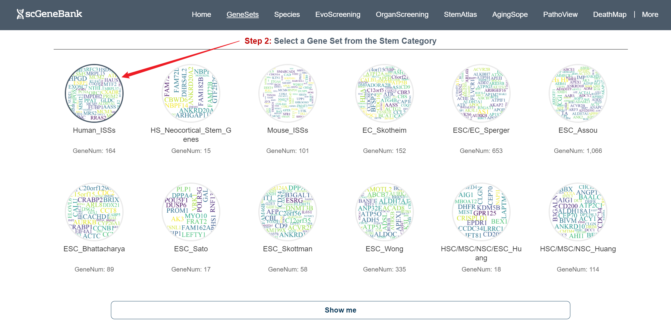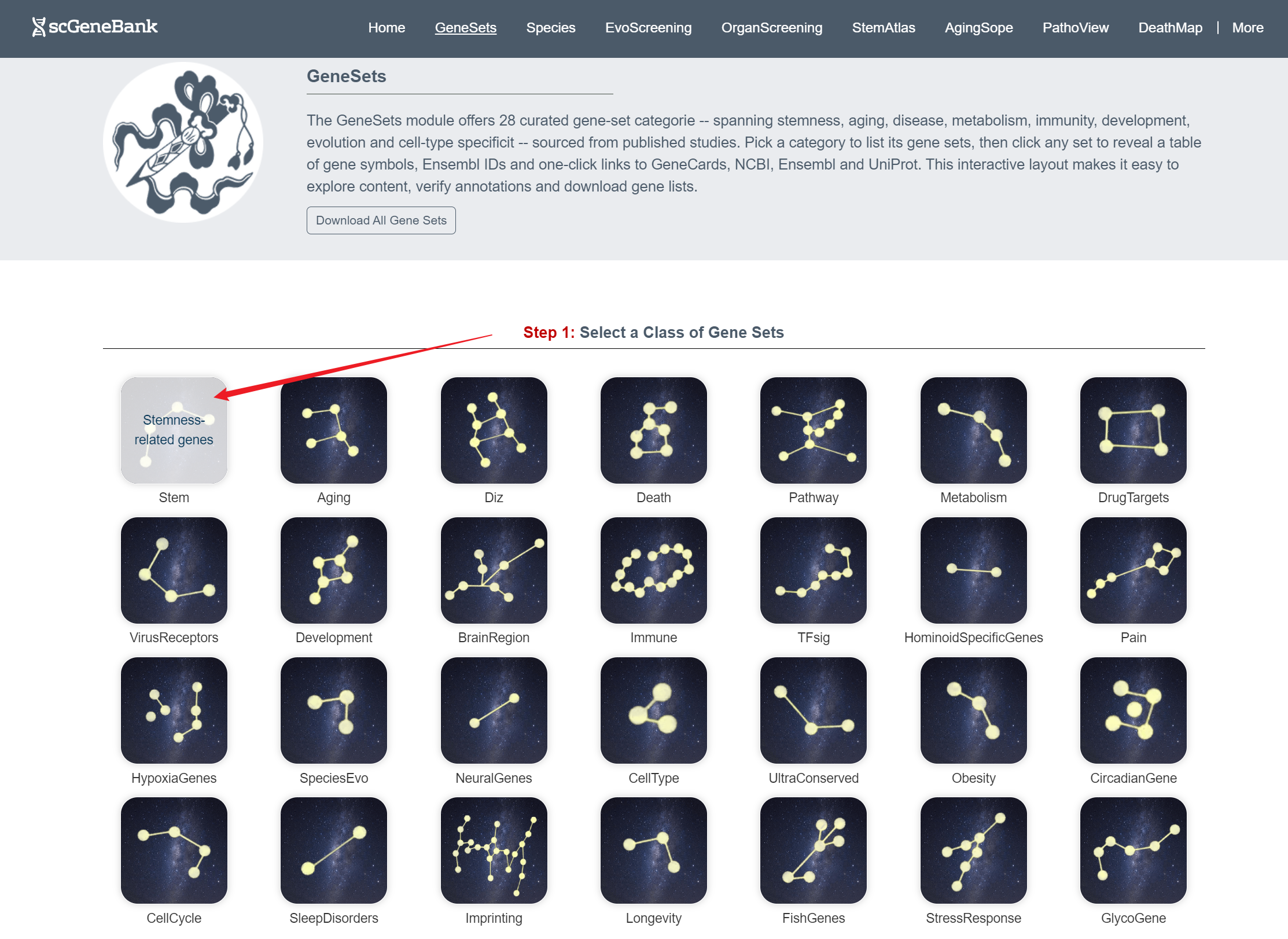 When a class is selected (e.g., Stem) in the Step1 panel, users can browse all associated gene sets within that class in the Step 2 panel.