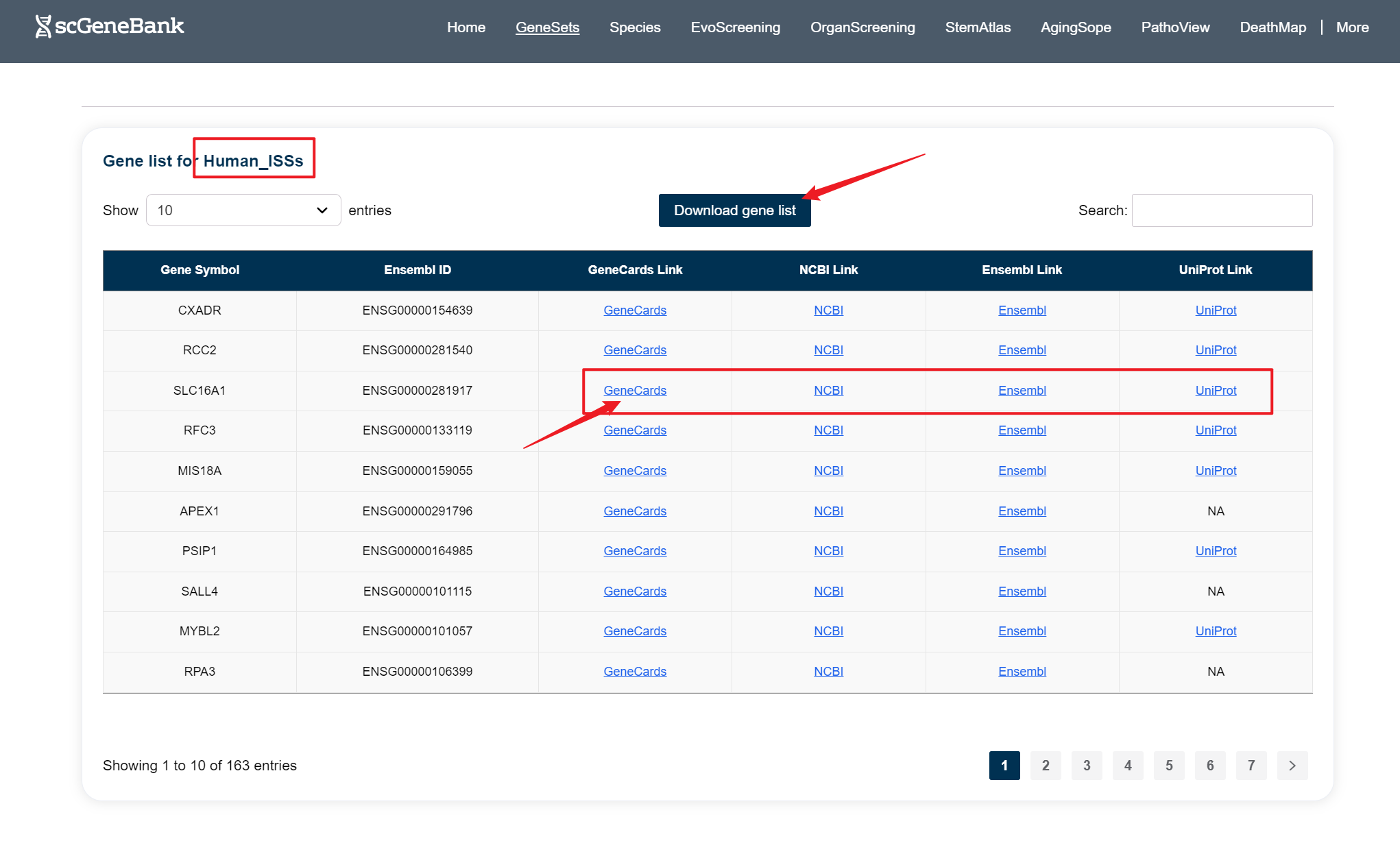 Clicking on a specific gene set reveals a detailed list of genes beneath the Step 2 panel, with each row displaying the gene symbol, Ensembl ID, and direct links to external resources including GeneCards, NCBI, Ensembl, and UniProt.