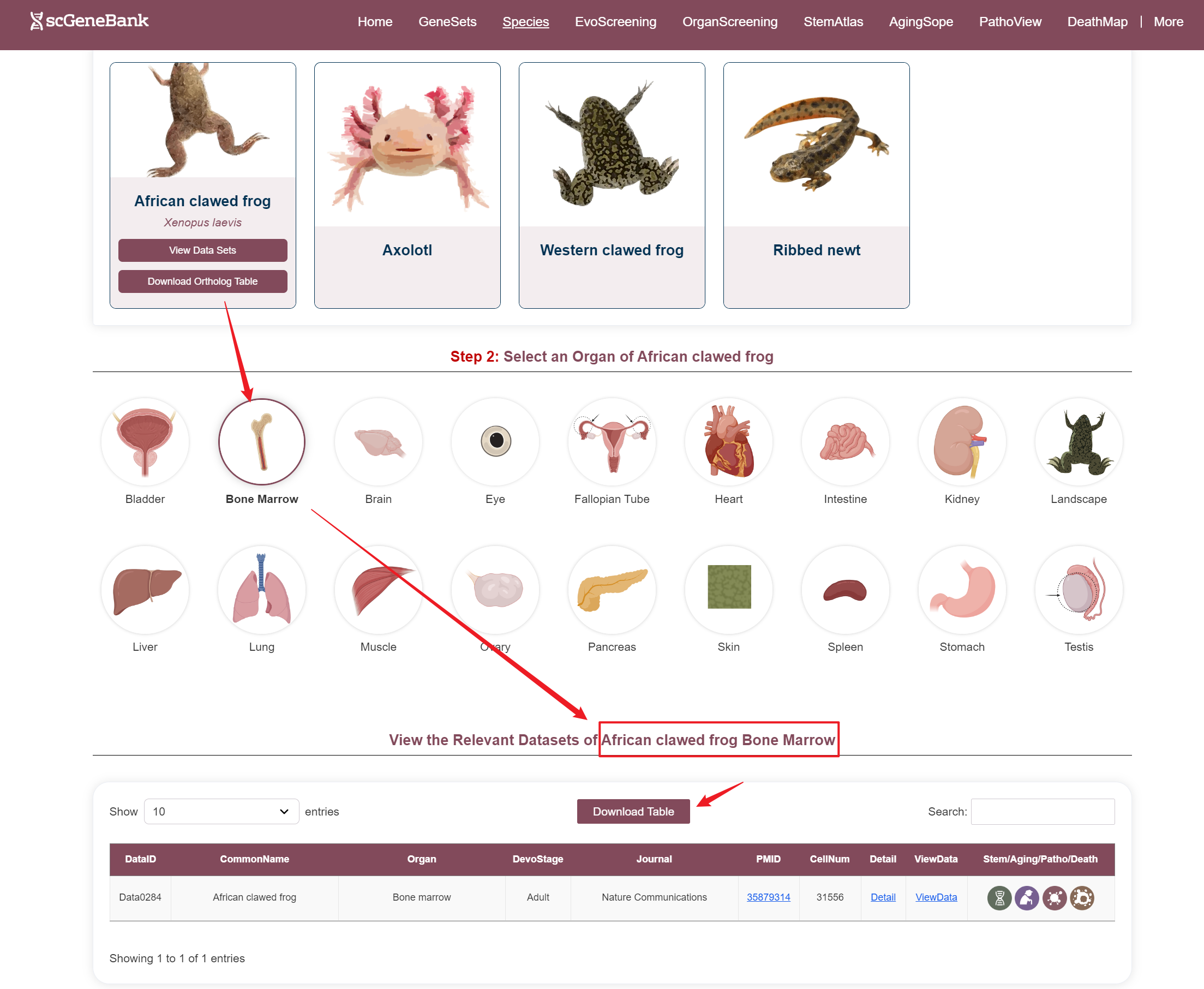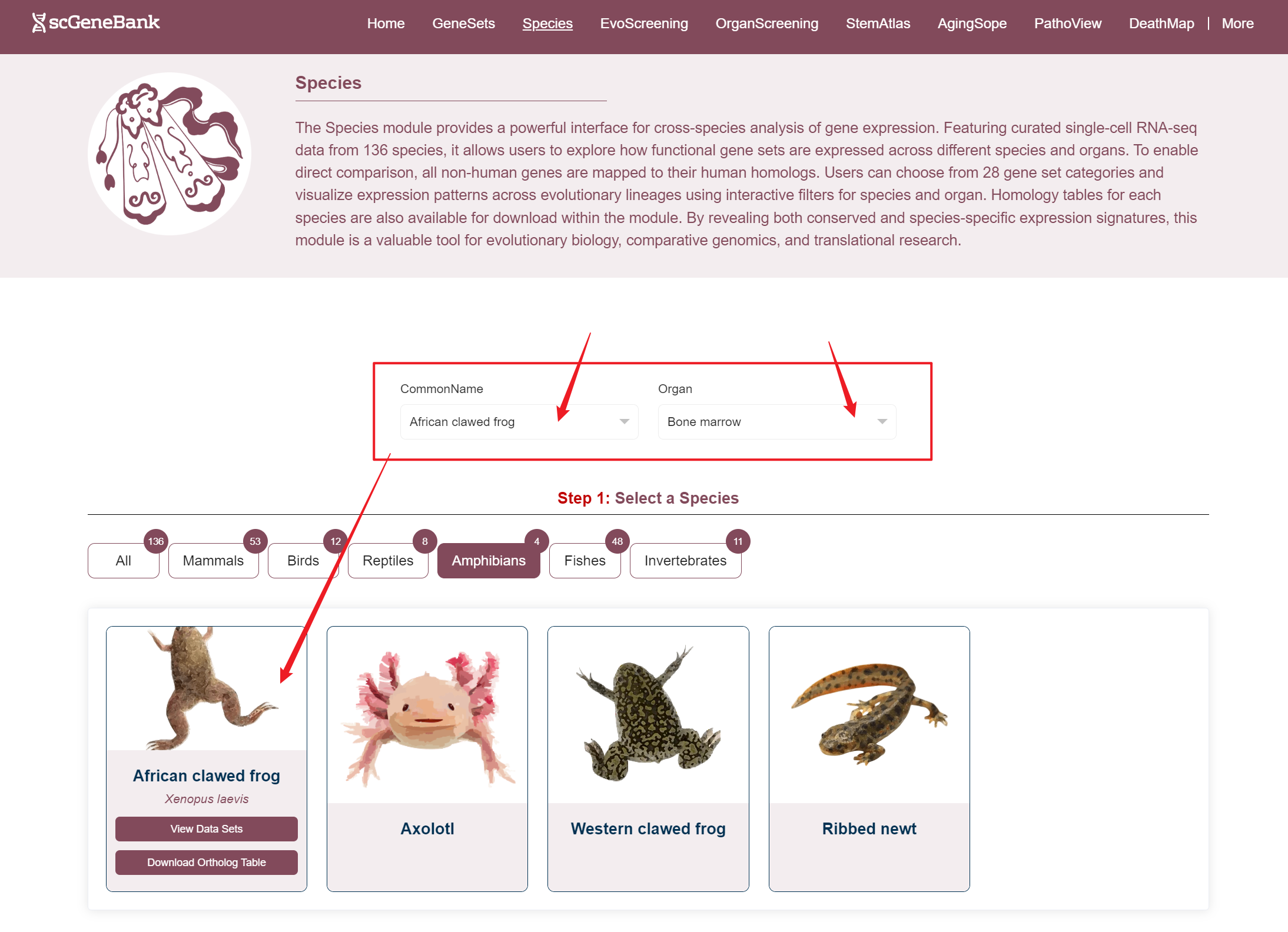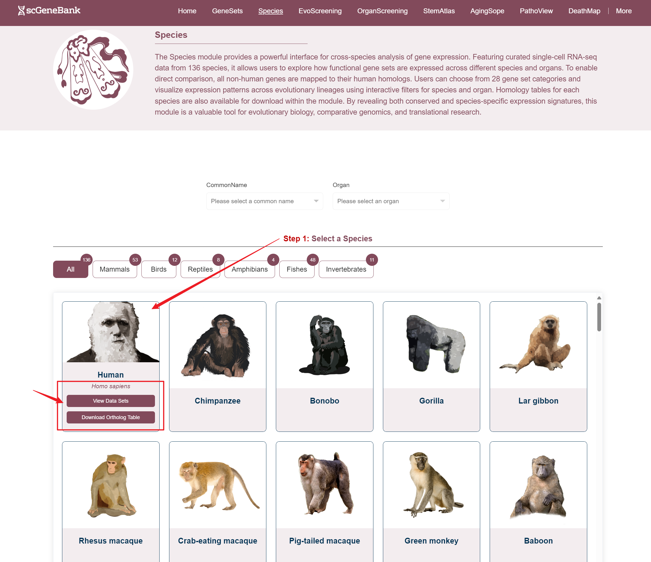 Users can access datasets in two ways: by filtering based on the species' common name and organ, or by clicking directly on a species image (in the Step 1 panel) and organ (in the Step 2 panel) to explore the data.When hovering over a species image, a tooltip appears showing the species' Latin name, a button to access related datasets, and a download option for the homology table.