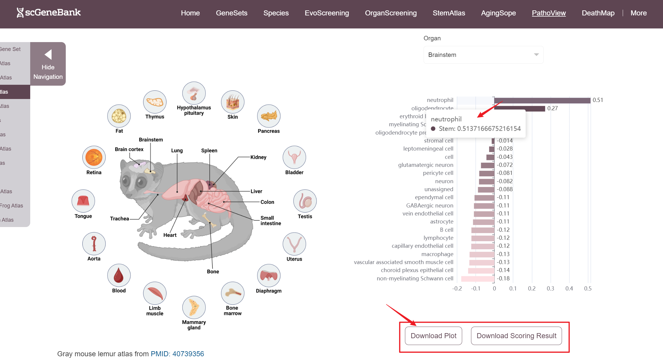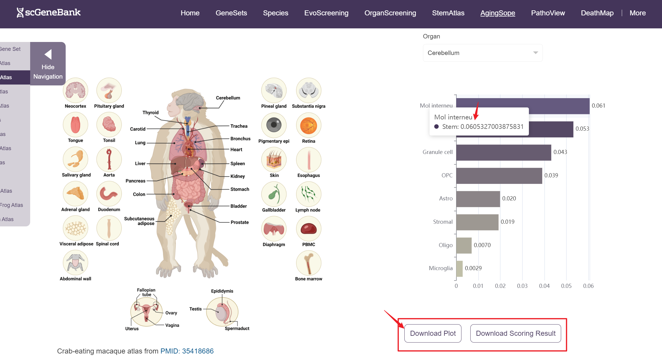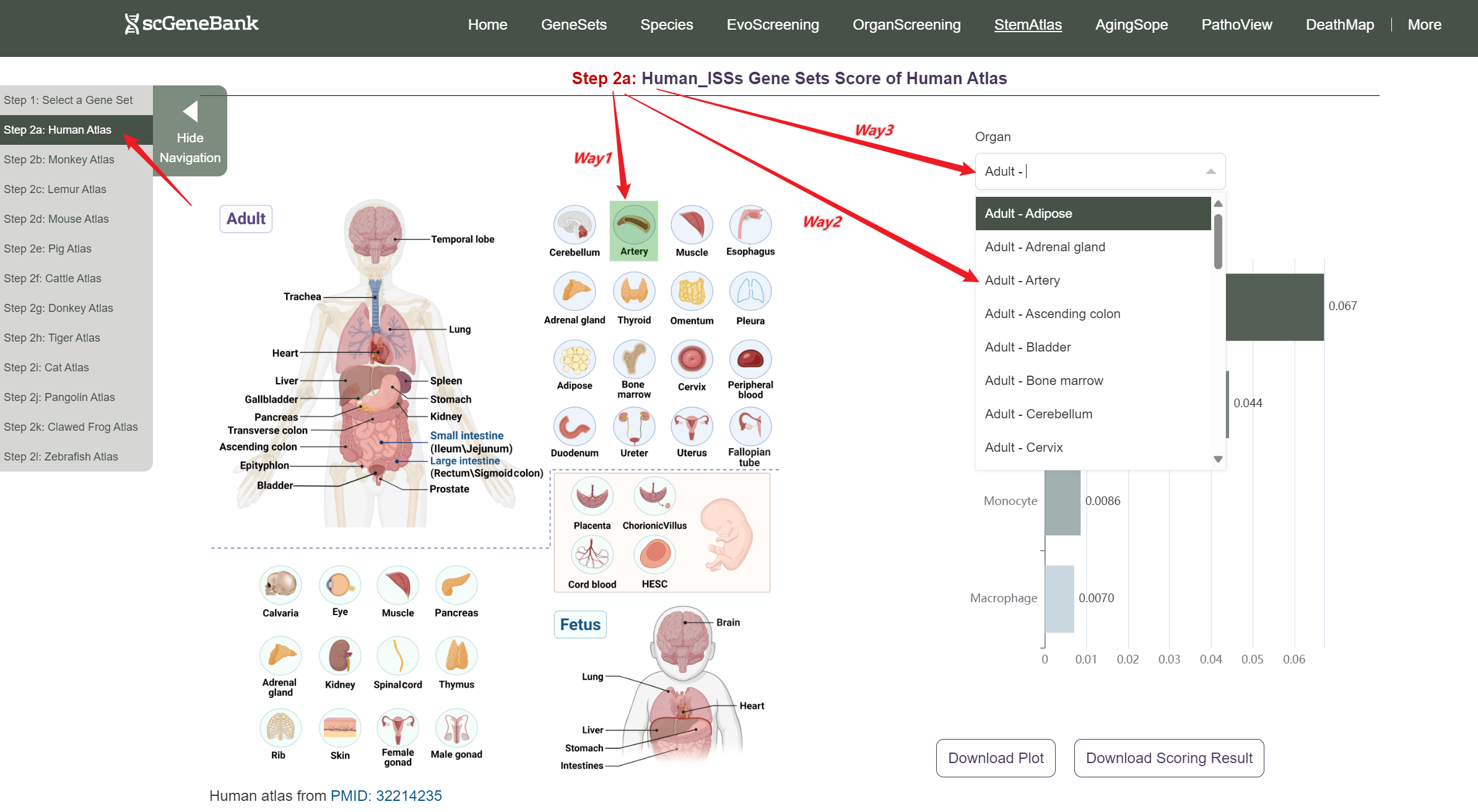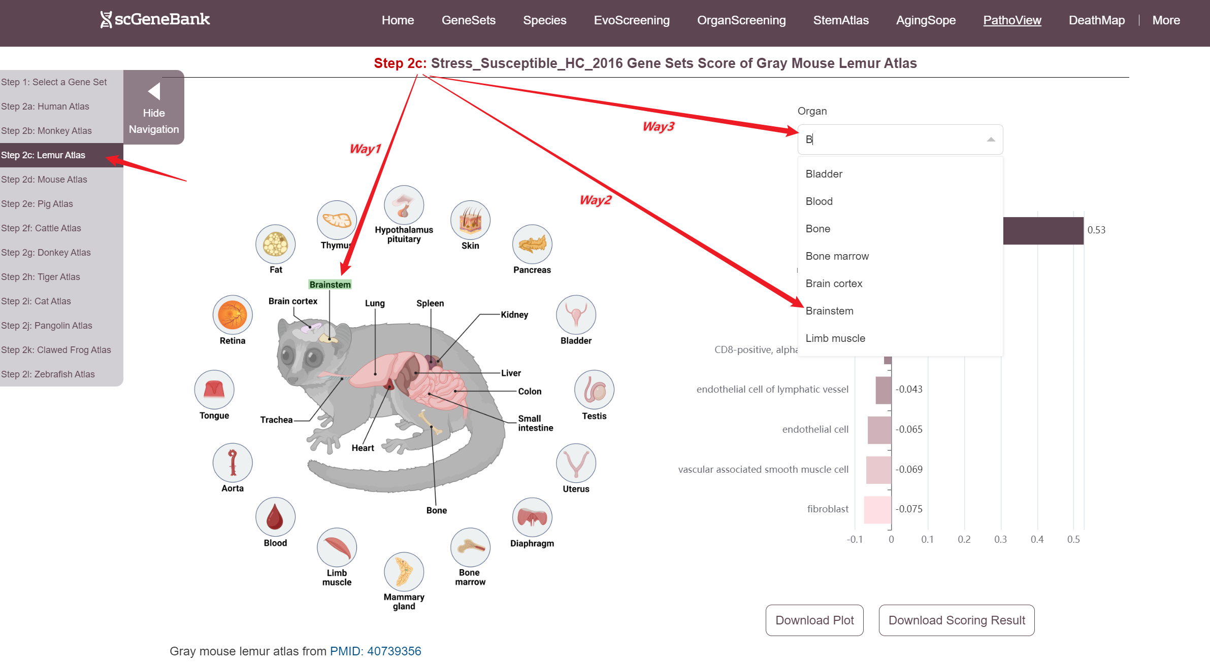 Next, scroll or click on the navigation bar at the bottom left to a specific display panel (12 species), then either click the corresponding region in the interactive anatomical diagram, use the filter bar to make a selection, or manually enter the target organ. Once the organ is selected, users can calculate gene set activity using the scanpy.tl.score_genes method.