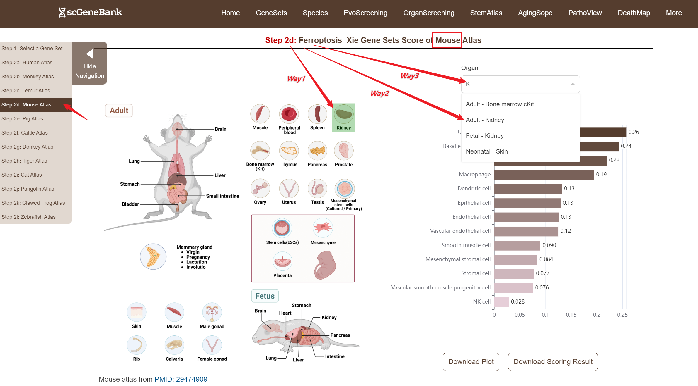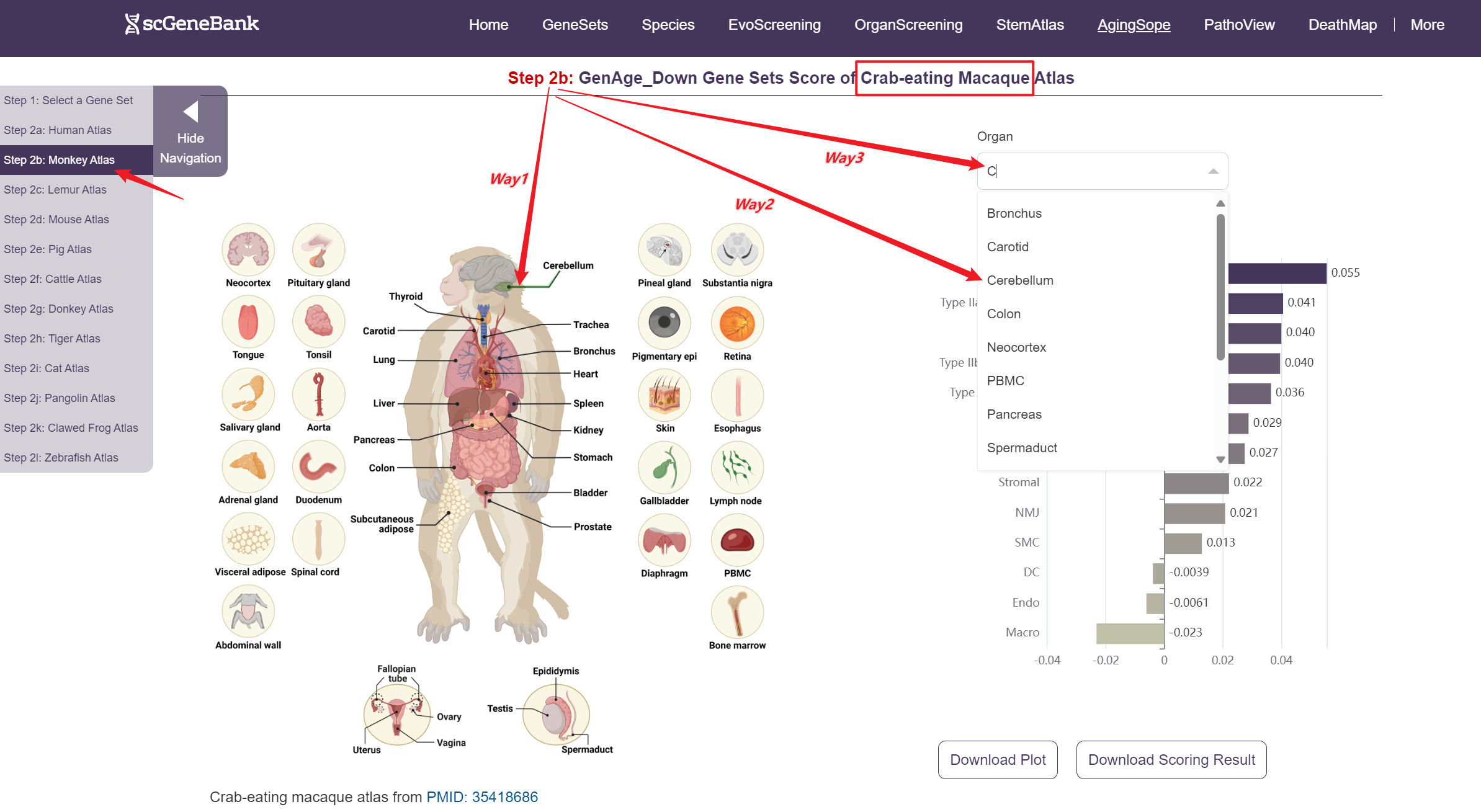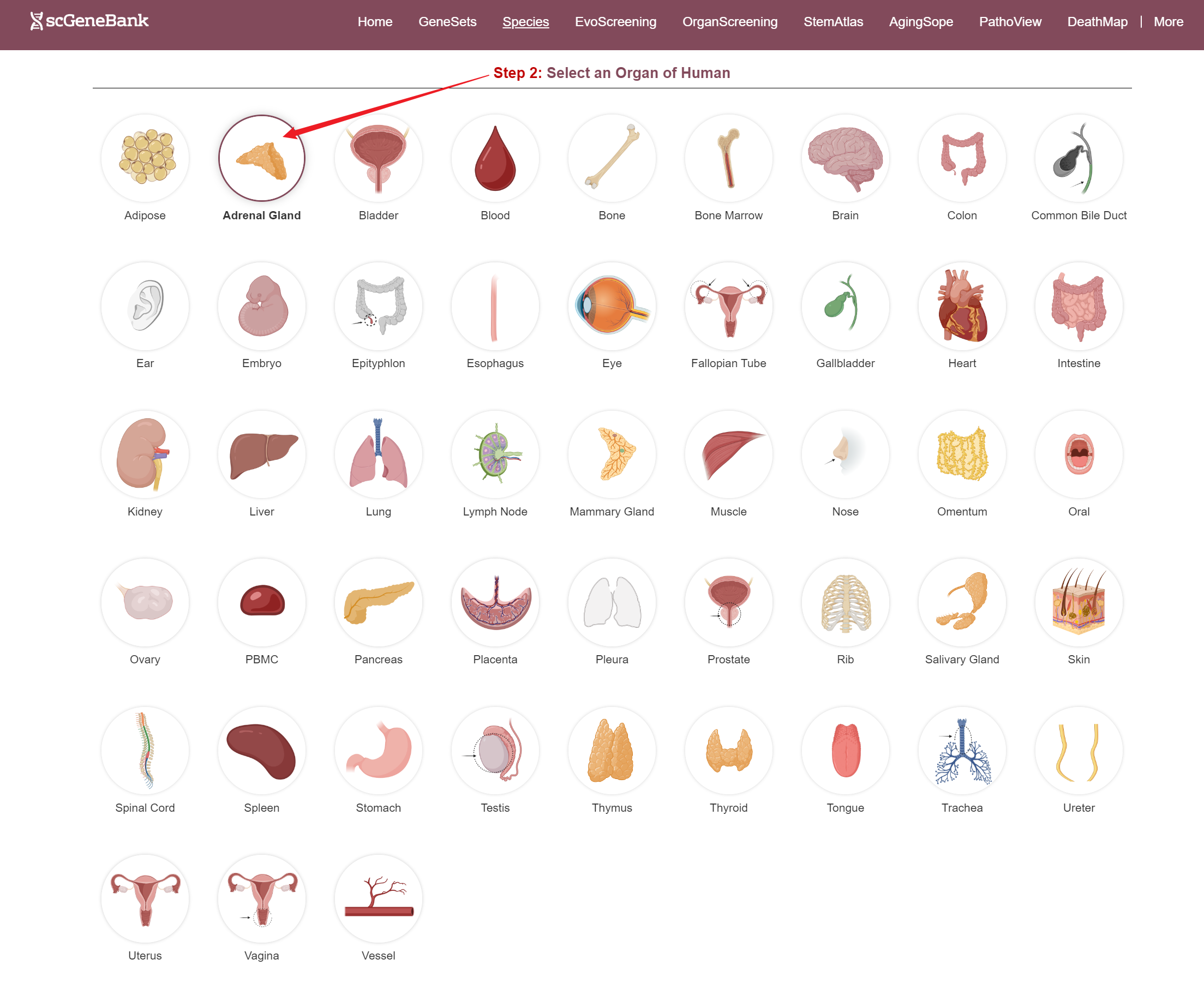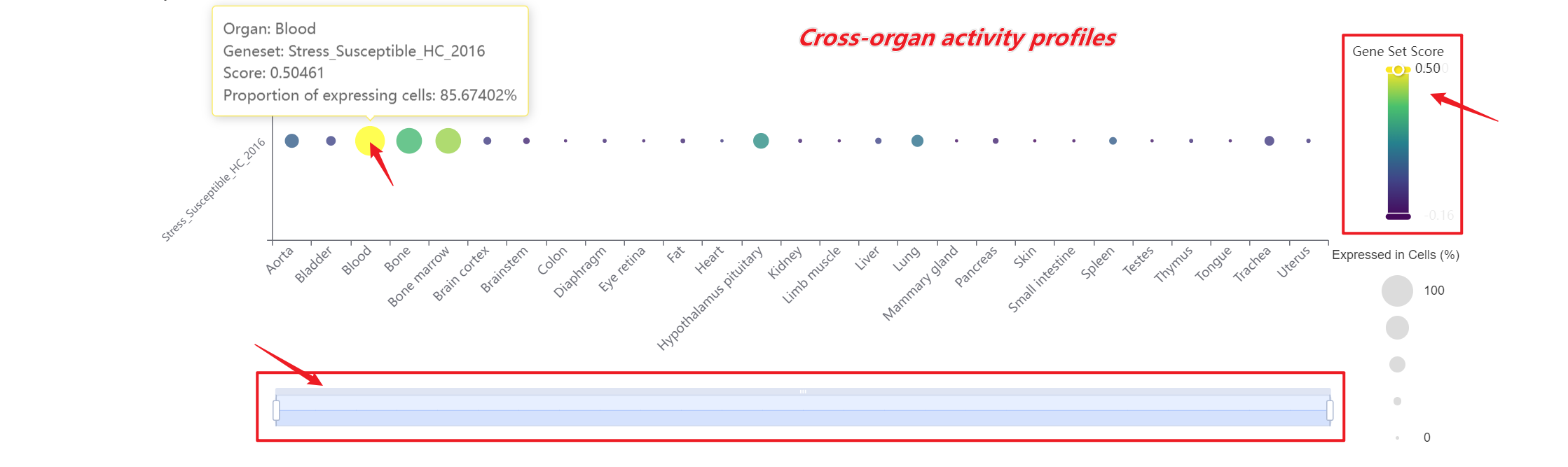 Next, scroll or click on the navigation bar at the bottom left to a specific display panel (12 species), then either click the corresponding region in the interactive anatomical diagram, use the filter bar to make a selection, or manually enter the target organ. Once the organ is selected, users can calculate gene set activity using the scanpy.tl.score_genes method.