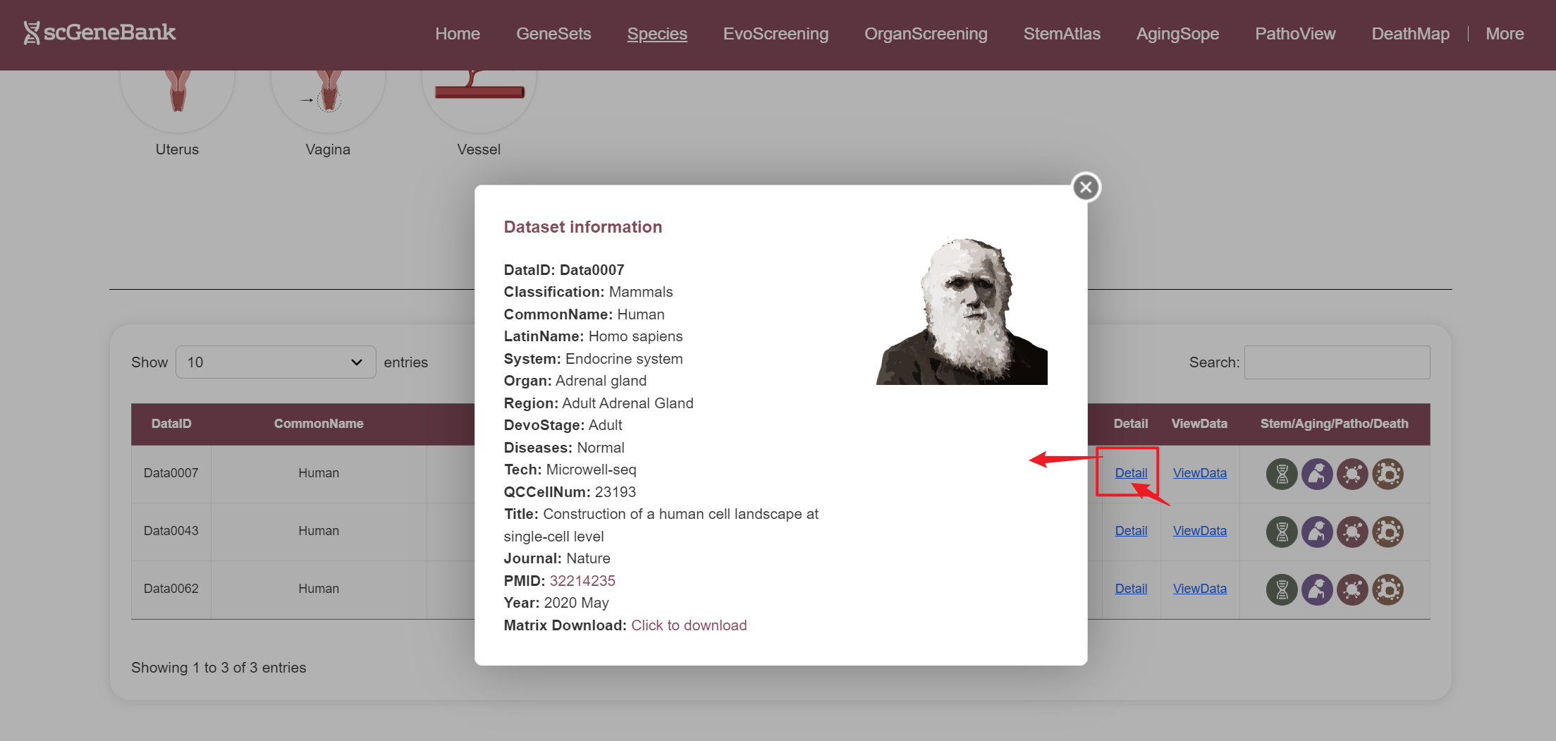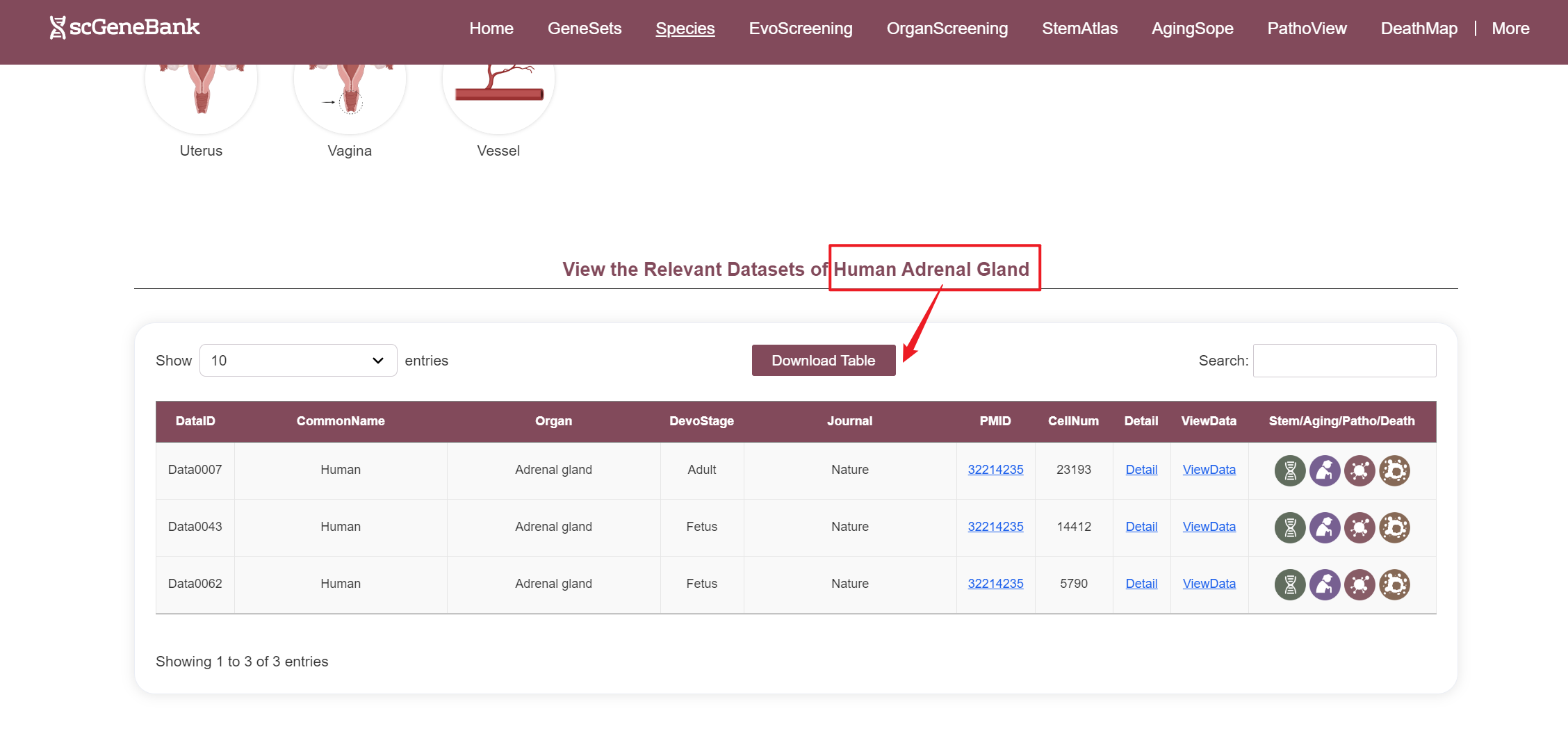 After selecting a species and organ, relevant datasets are displayed in a table. Each row includes the species' common name, organ name, developmental stage, journal name, PMID, cell count, and interactive access to additional information.