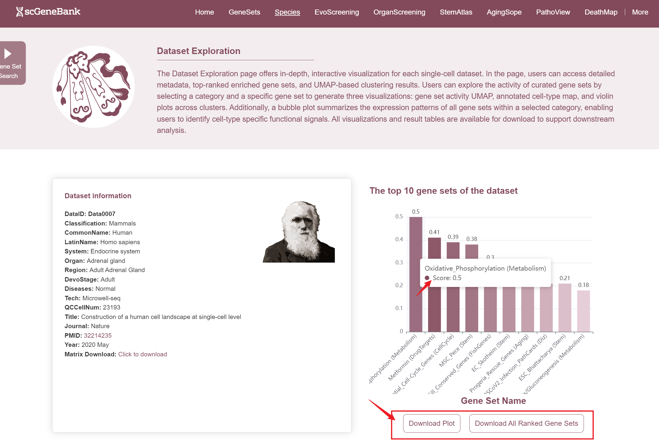 In ViewData page, the first section offers an overview of the dataset's core information and function highlights. One the left, the Dataset Infomation panel summarizes key details, including the dataset ID, species classification, common and Latin names, biological system, tissue, region, developmental stage, sequencing technology, quality-controlled cell count, and publication details such as journal name, PMID, and year. A direct link is also provided for downloading the expression matrix. On the right, it displays the top 10 enriched gene sets in the dataset, ranked by activity scores. Users can hover over the corresponding bars to view the full gene names and their specific scores. Additionally, below the bar chart, users can download the complete bar chart and the ranked gene set results table.