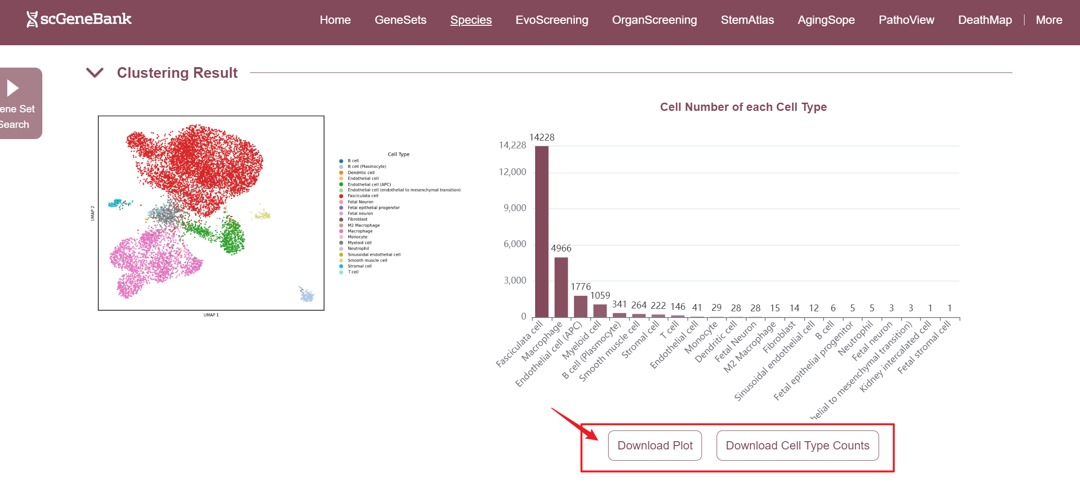The second section of the ViewData page presents the dataset's clustering results and offers an overview of cell type composition. On the left, a UMAP Plot displays a two-dimensional embedding of cells based on their transcriptomic profiles, with each dot representing a single cell and colors indicating assigned cell types or clusters. On the right, it shows the number of cells per identified cell type, allowing users to quickly assess population abundance and diversity. Both the cell count plot and the result table can be downloaded. Also, the plot can be enlarged by clicking.