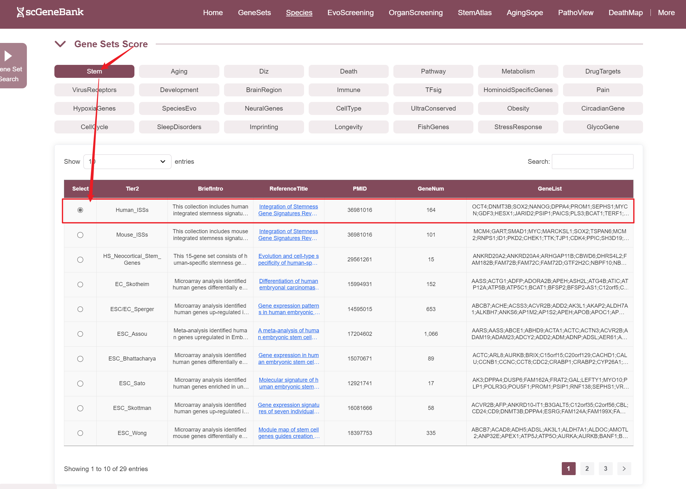 To begin, users select a biological category (e.g., Stem, Aging, Immune) to view all associated gene sets. From the resulting table, a specific gene set can be chosen—each entry includes the gene set name, a brief description, reference information, gene count, and a preview of included genes.