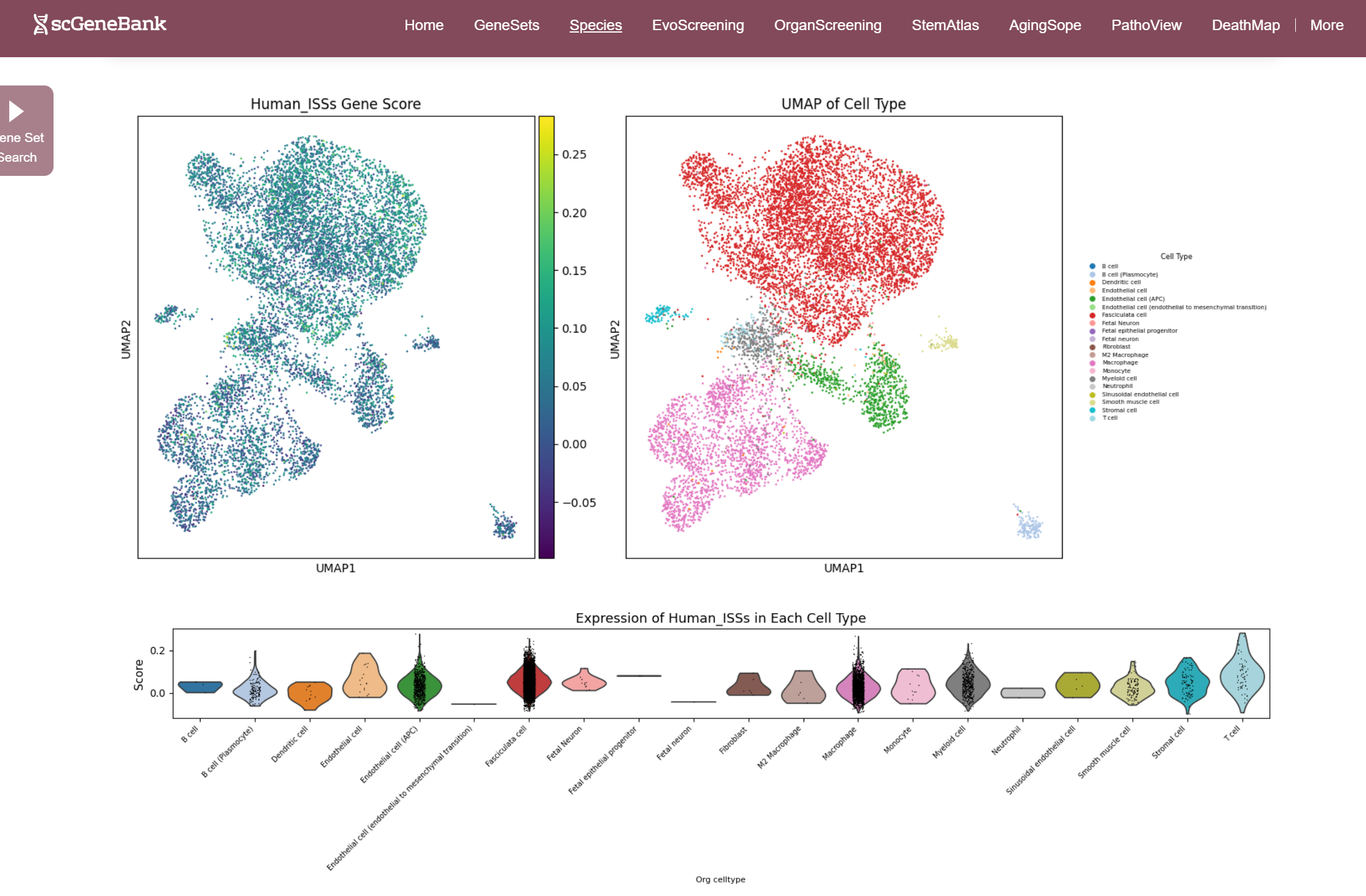Once selected, three visualizations are generated: a UMAP plot showing gene set activity across all cells (colored by score), a UMAP plot indicating cell type assignments, and a violin plot displaying the distribution of gene set activity across cell types. Those plots can be enlarged by clicking.