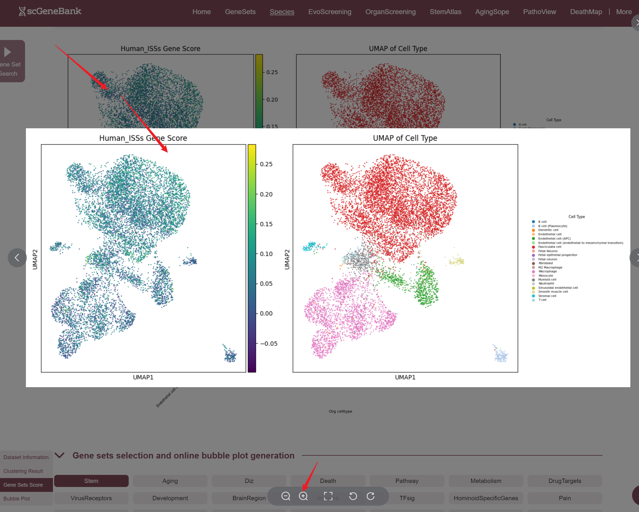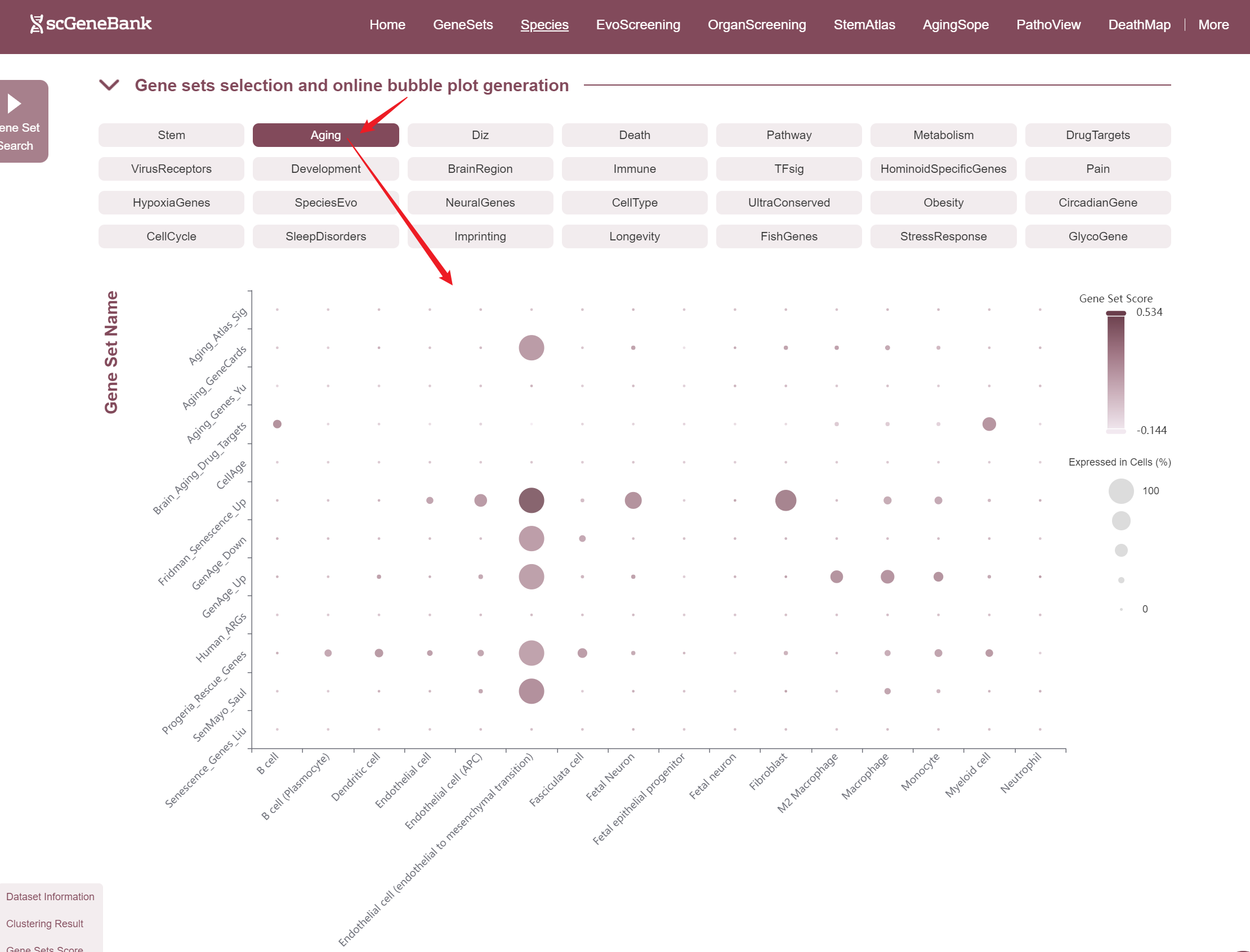 --By clicking “ViewData”, users can access a detailed page for the selected dataset, including dataset information, clustering results, and the bubble plot of the scoring results for each of 28-categories gene sets. To specifically analyze Stem/Aging/Patho/Death gene sets, users can also click the icon in the table's last column to view their dedicated detail pages.