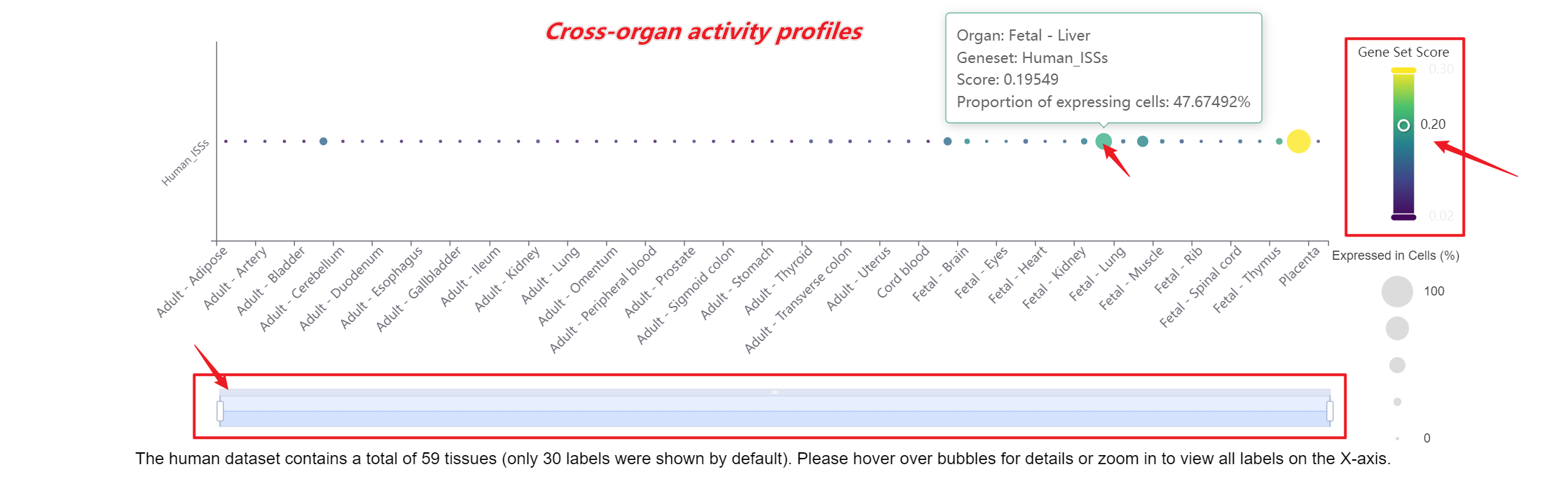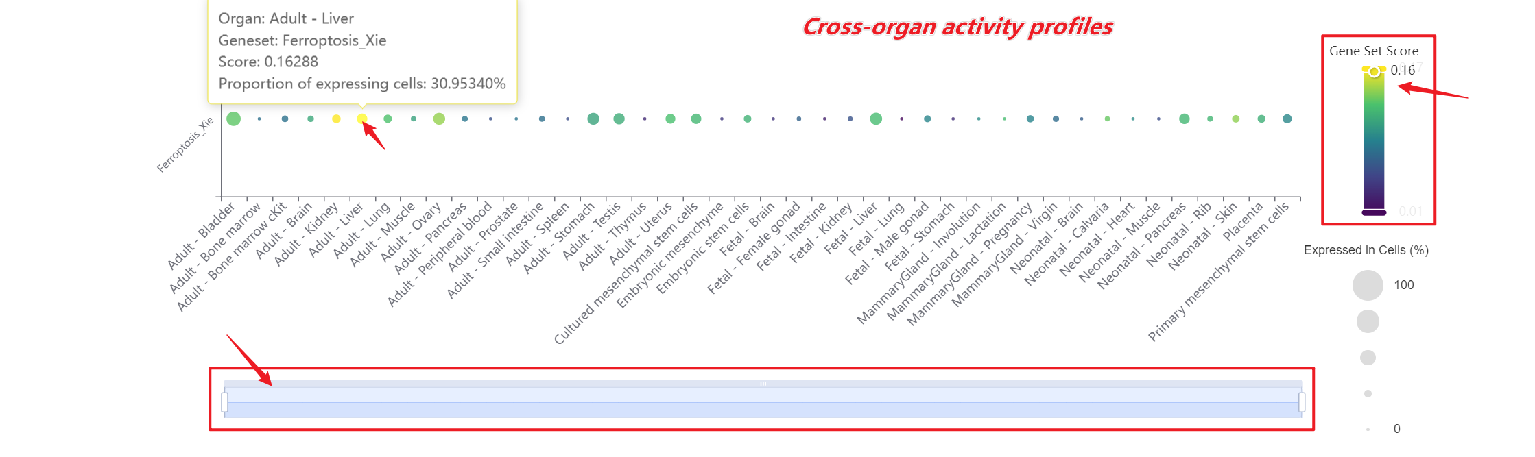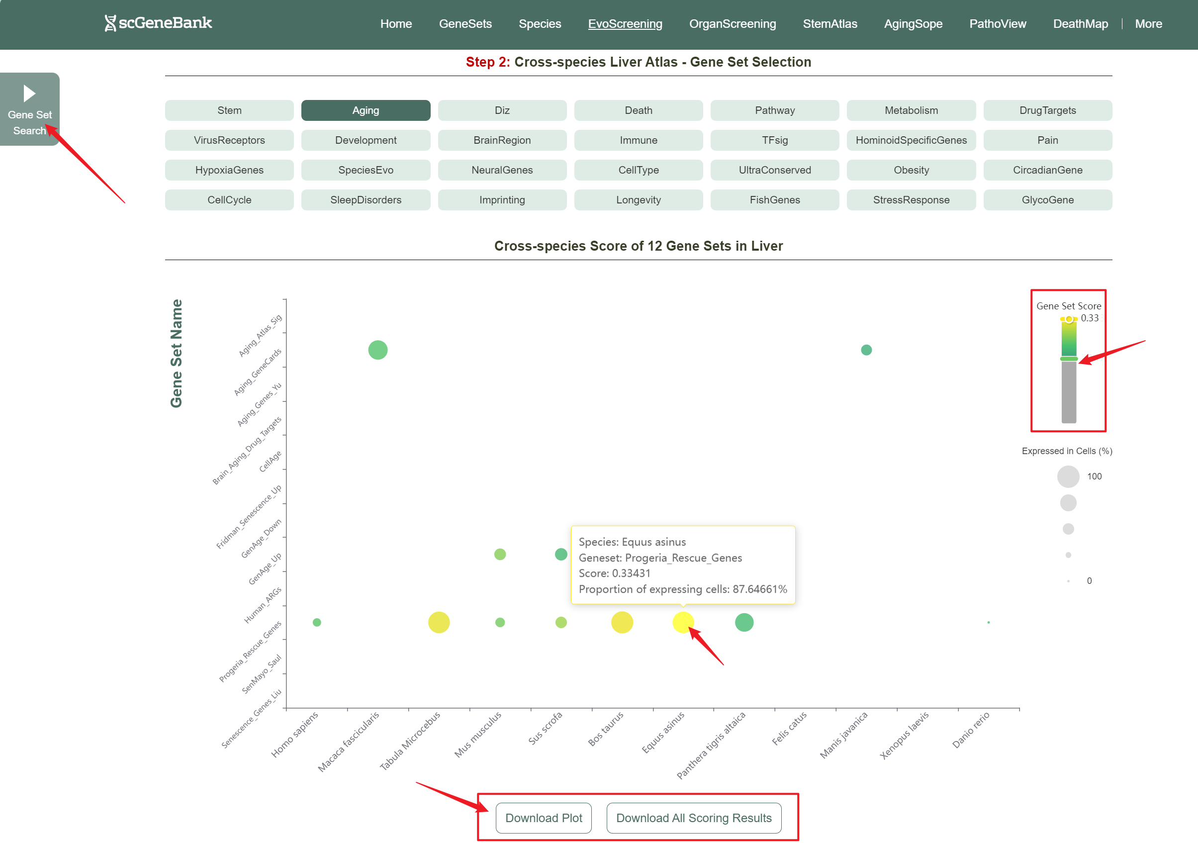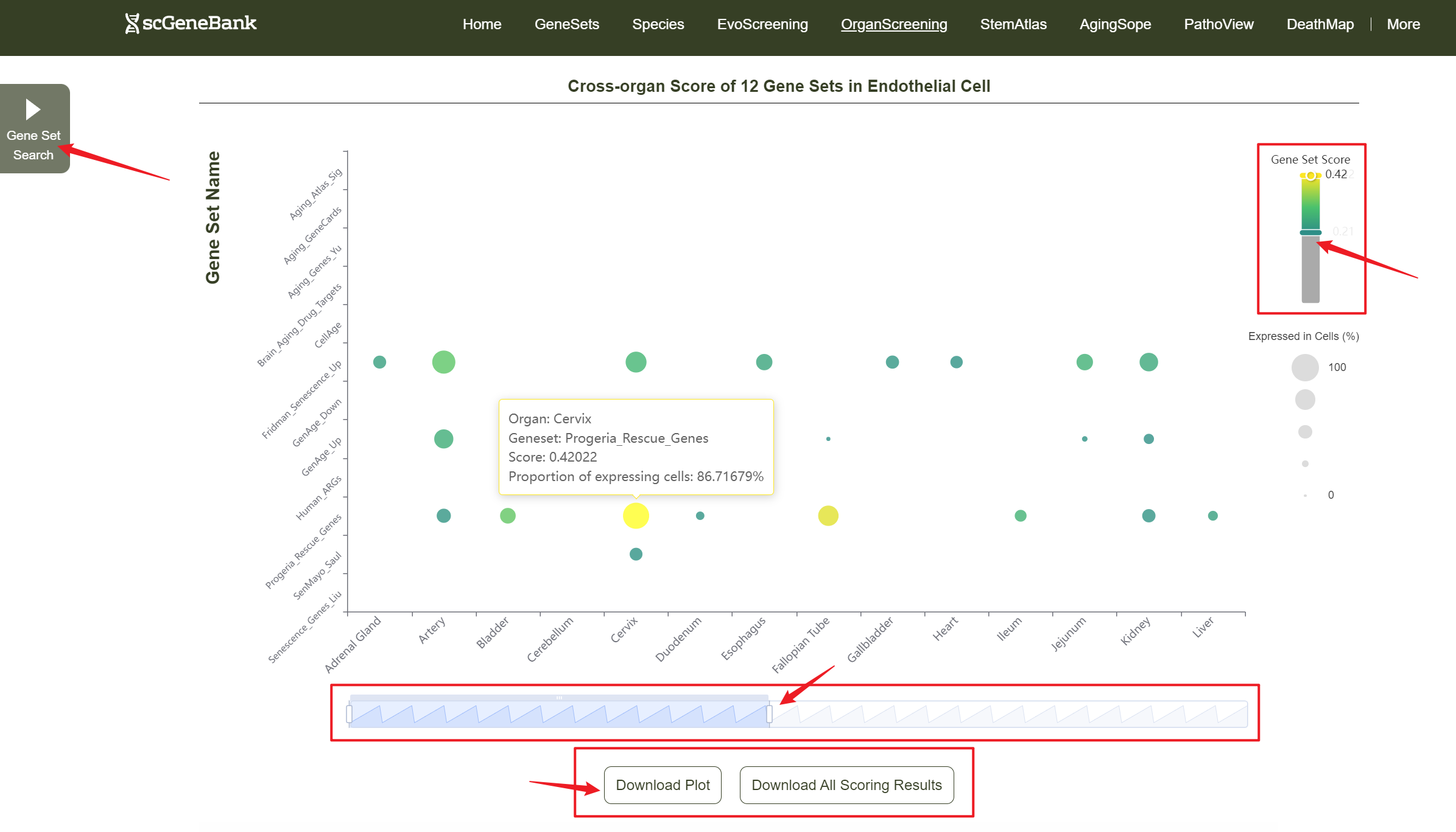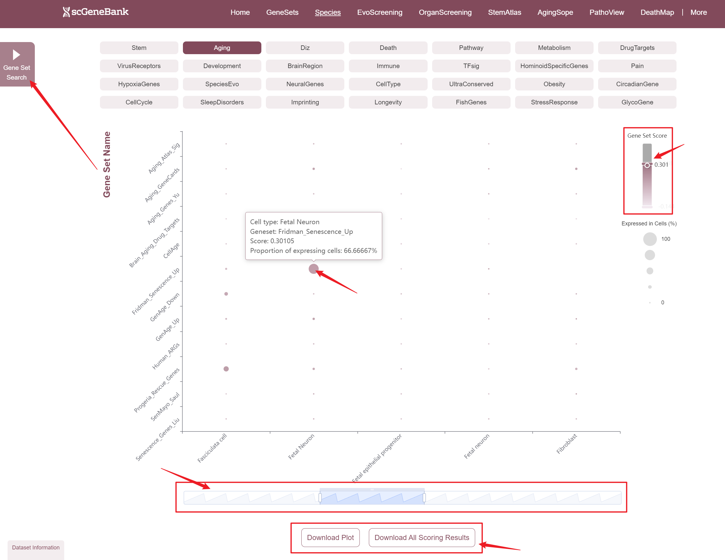 Users can drag the "Gene Set Score" color bar to filter values by gene activity or adjust the horizontal axis width below to refine cells of interest. Hovering over bubbles reveals detailed information, while clicking "Gene Set Search" (top-left) allows querying specific gene sets for comprehensive data. Both the score table and bubble plot can be downloaded for further analysis or presentation.