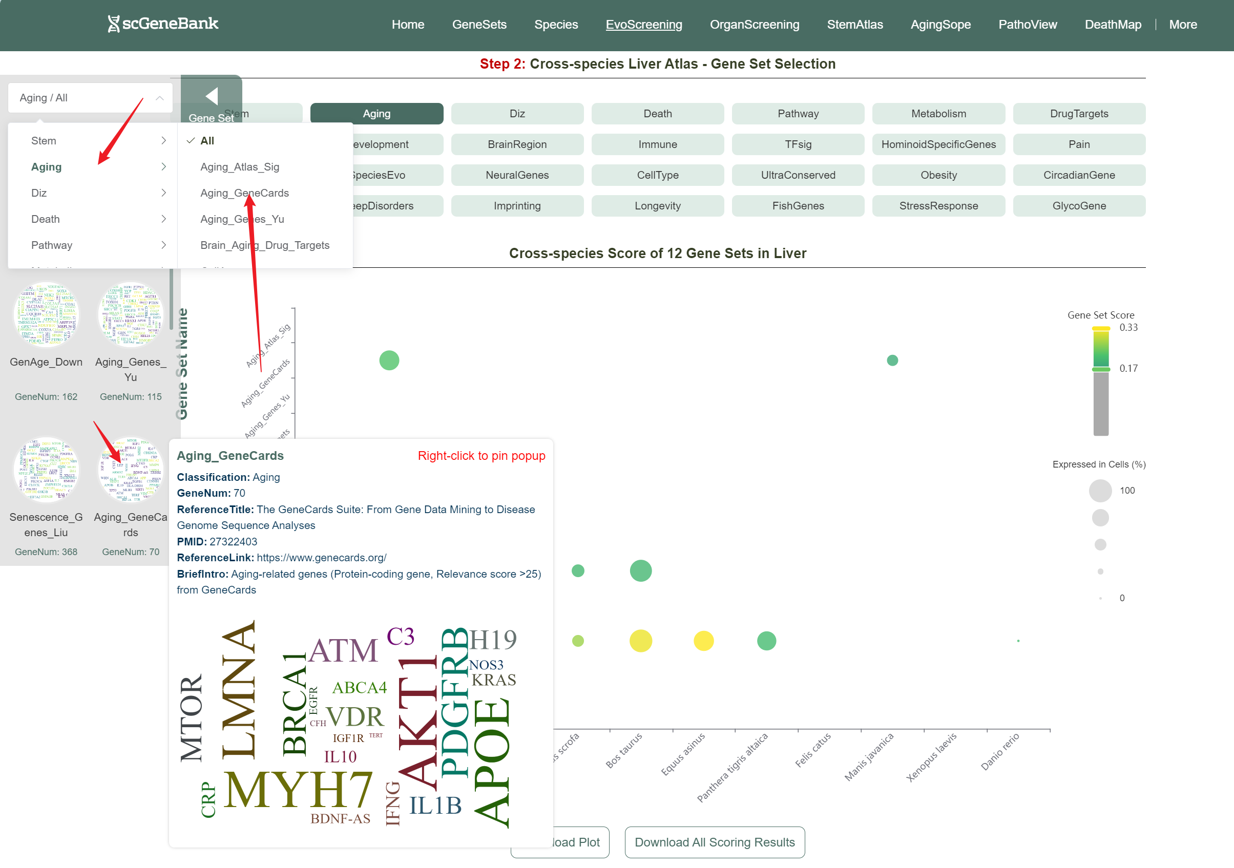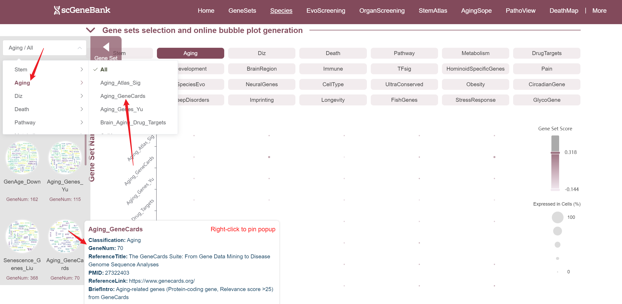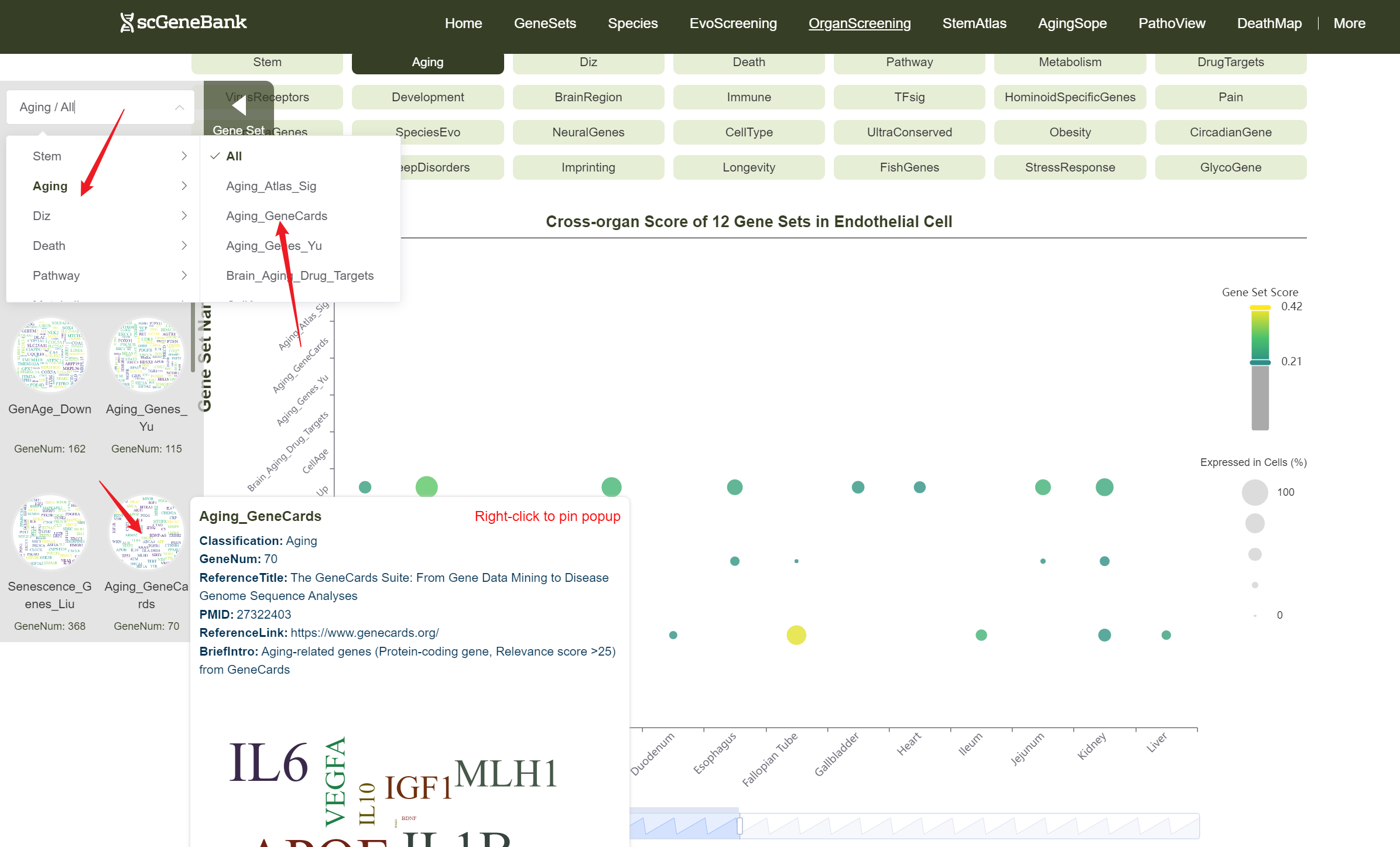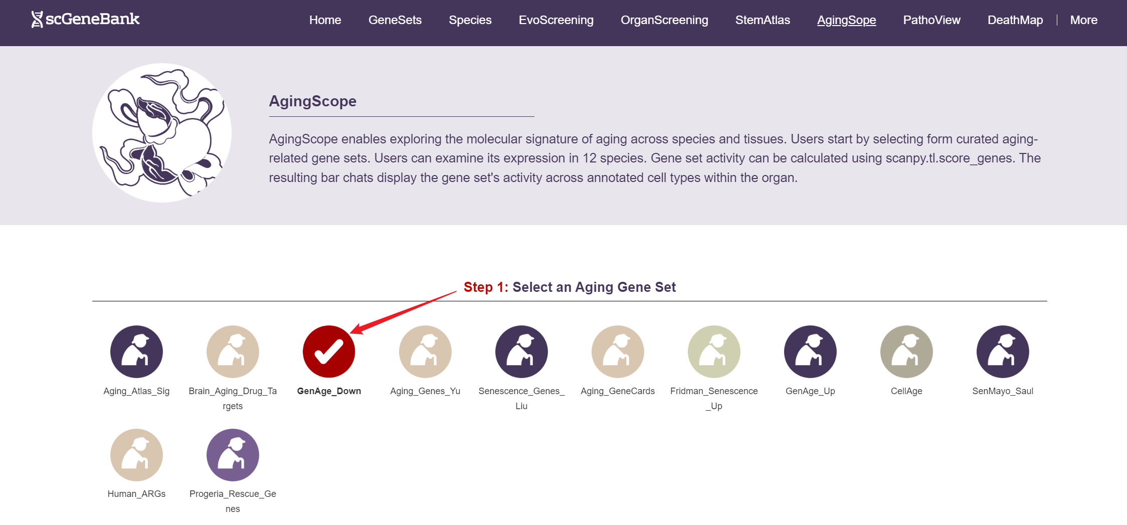 To begin, select an aging-related gene set by clicking on its icon-options.
