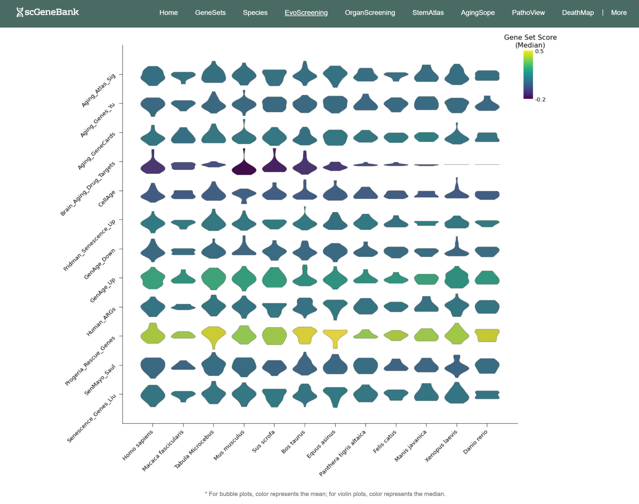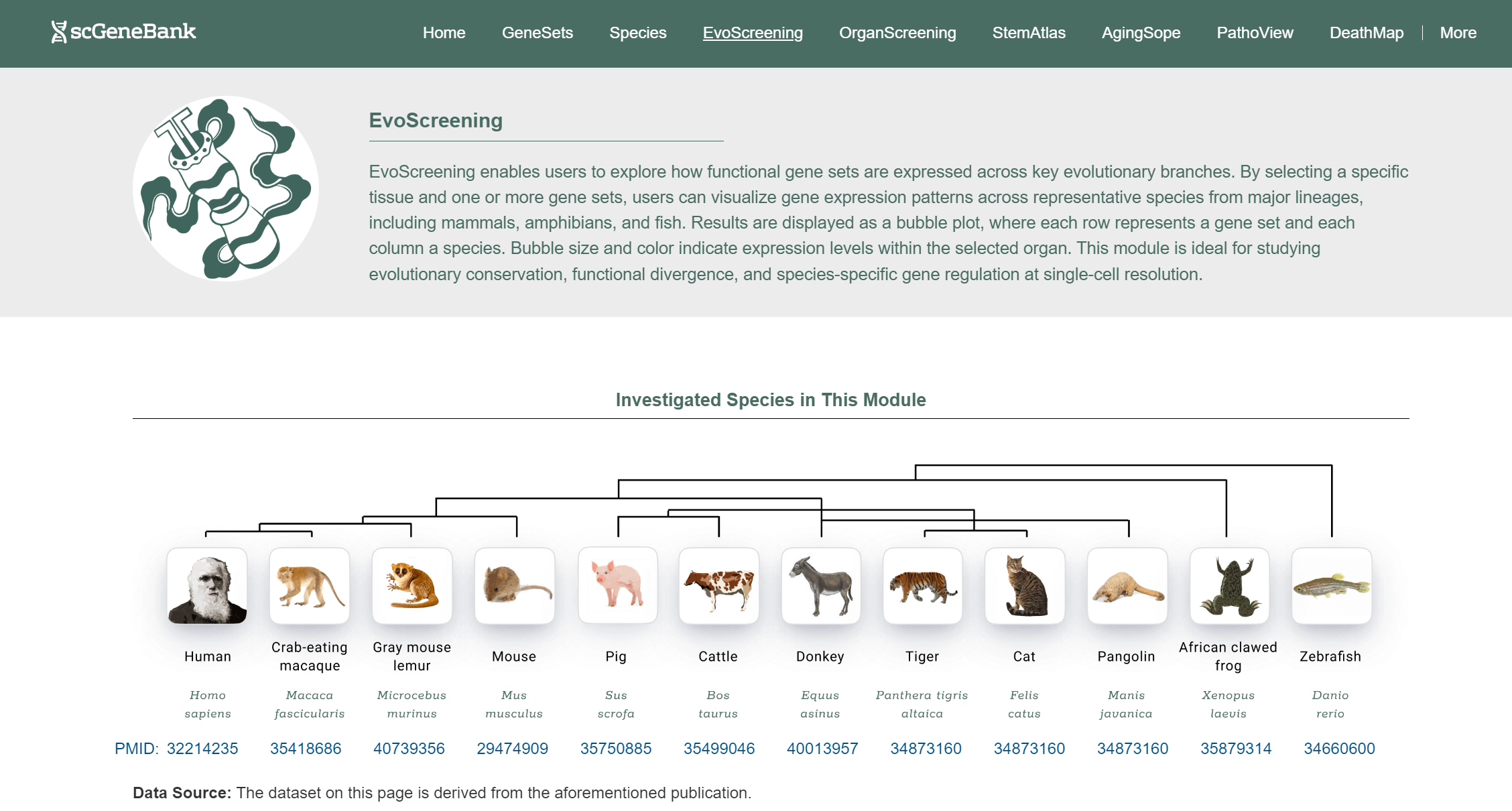 The GeneSets module allows users to explore and retrieve curated functional gene sets across 28 biological categories, each supported by detailed gene-level information and external database links. The Species module enables users to explore the expression of functional gene sets across 136 species at single-cell resolution. EvoScreening and OrganScreening allow users to visualize the expression of selected gene sets across evolutionary key species or human organs, respectively. StemAtlas, AgingScope, PathoView, and DeathMap offer focused expression analysis of gene sets related to stemness, aging, disease, and cell death, respectively.Each module enables users to explore these signatures across organs and cell types in human, crab-eating macaque, mouse, zebrafish and fly.
