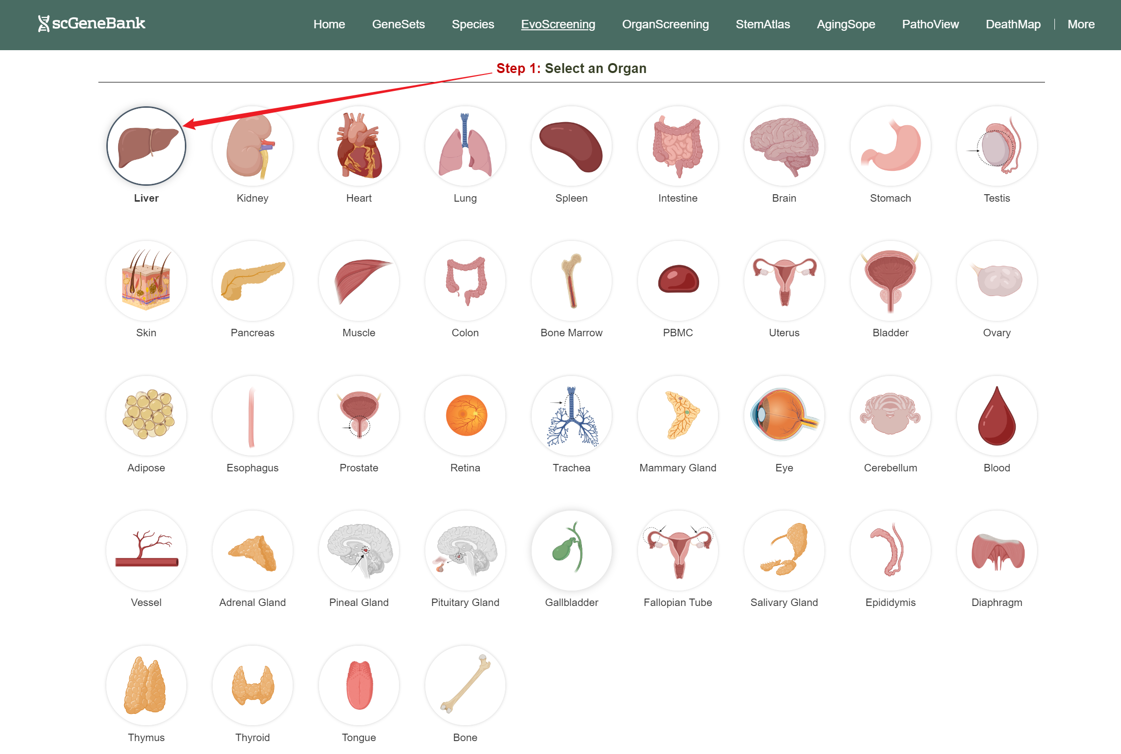 To begin, click on an organ antomical icon in the Step 1 panel.