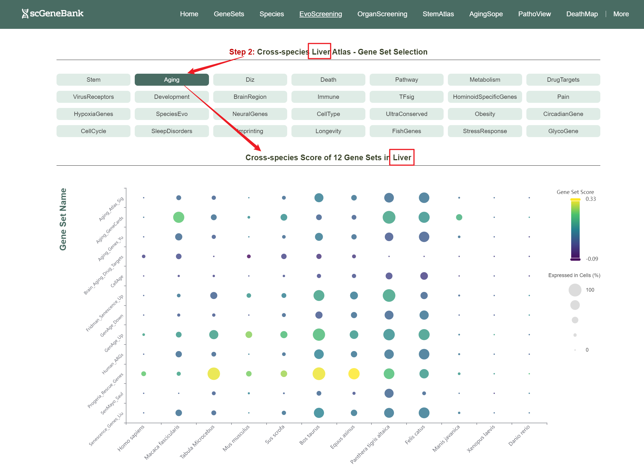 Then, choose a functional gene category (e.g., Aging) to generate a bubble plot showing gene set activity within selected organ across species. The color intensity of each bubble reflects the mean gene set score, while the bubble size indicates the proportion of cells expressing the gene set within a selected organ.