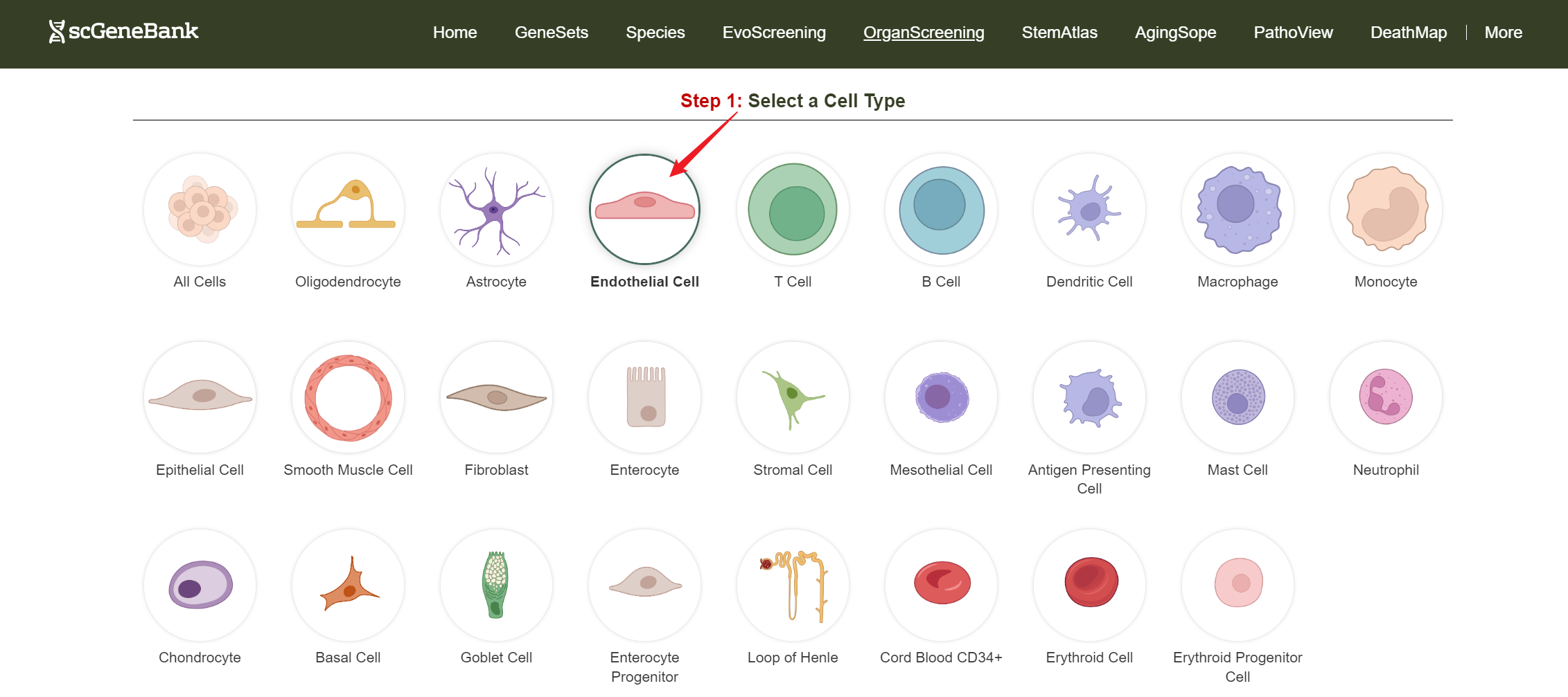To get started, click on a cell type of interest (e.g., Endothelial cell).