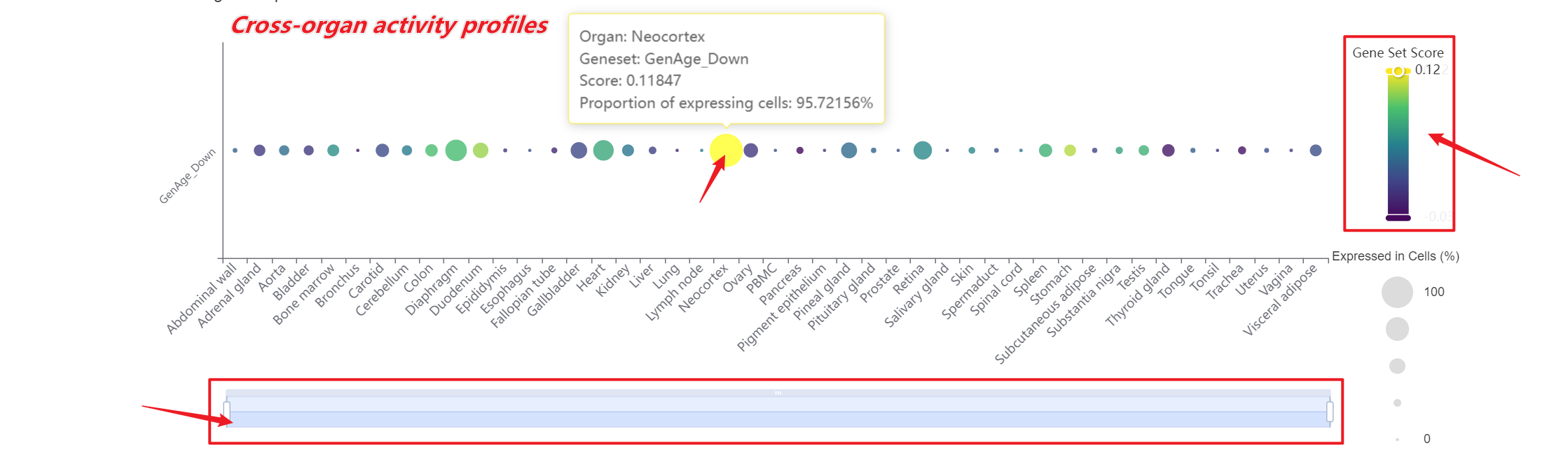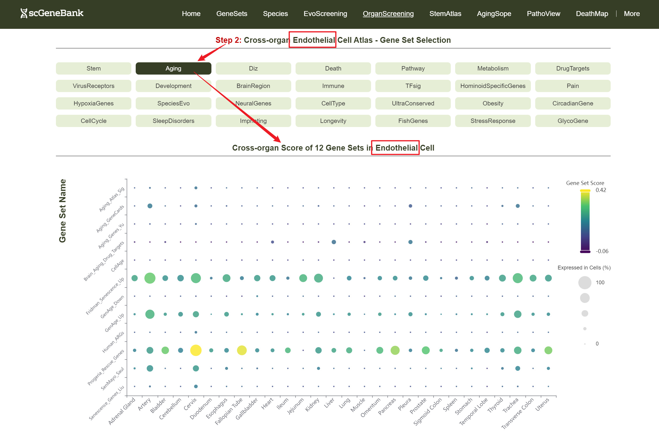 Then, choose a functional gene category (e.g., Aging) to generate a bubble plot showing gene set activity across organs for the selected cell type. The color intensity of each bubble reflects the mean gene set score, while the bubble size indicates the proportion of cells expressing the gene set within a organ cell type.