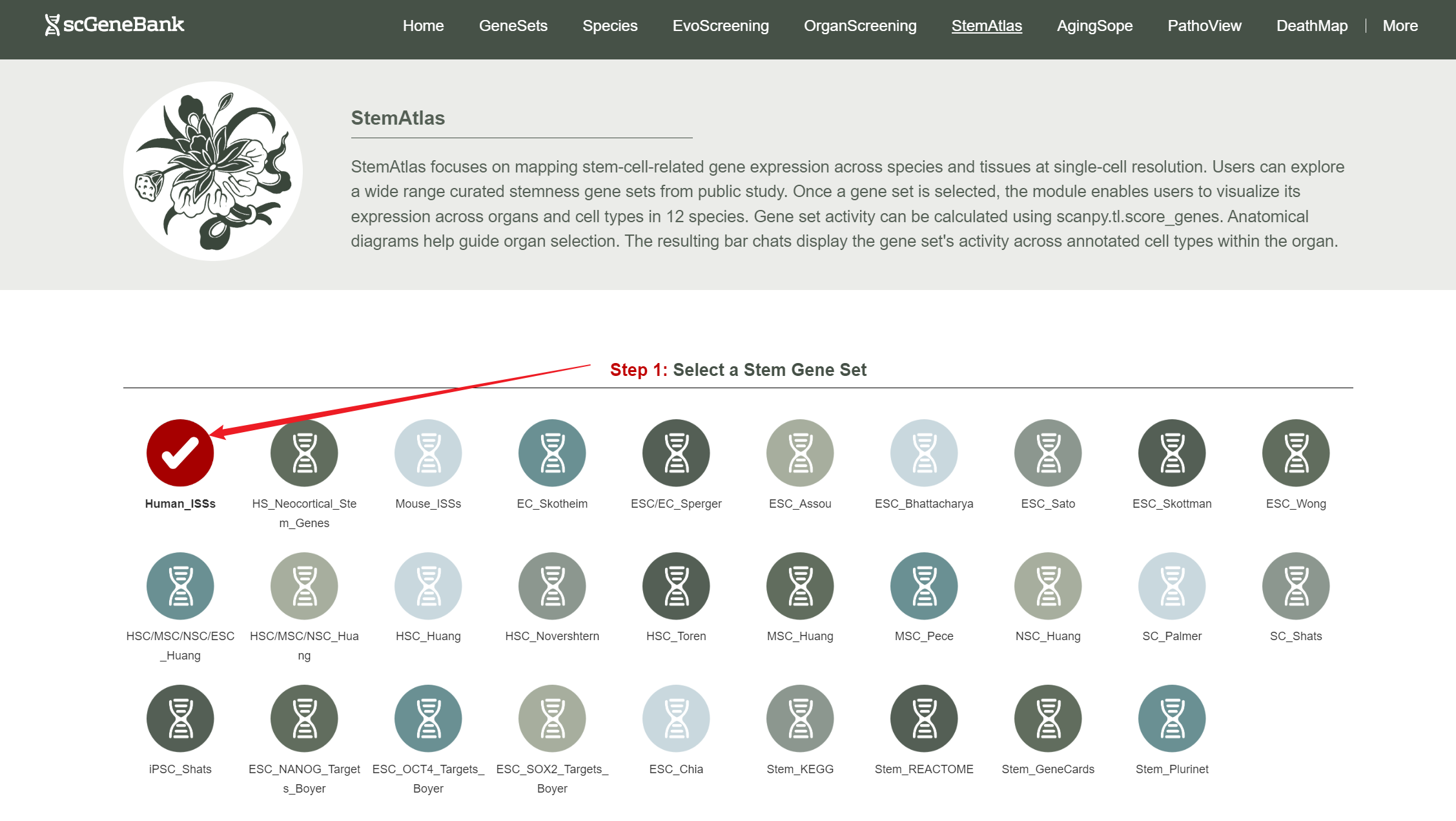 To begin using StemAtlas, first select a stemness-related gene set by clicking on its icon-options.