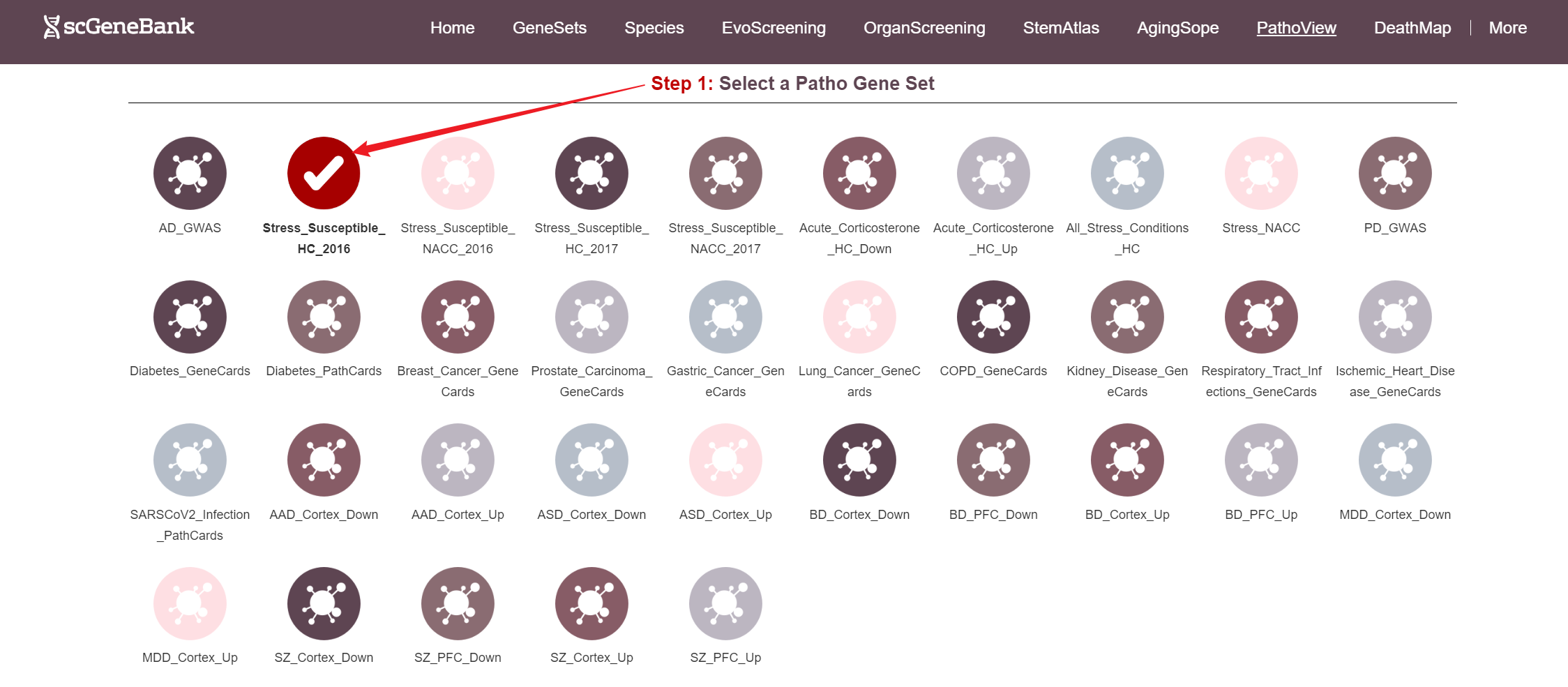 To begin, select a disease-related gene set by clicking on its icon-options.