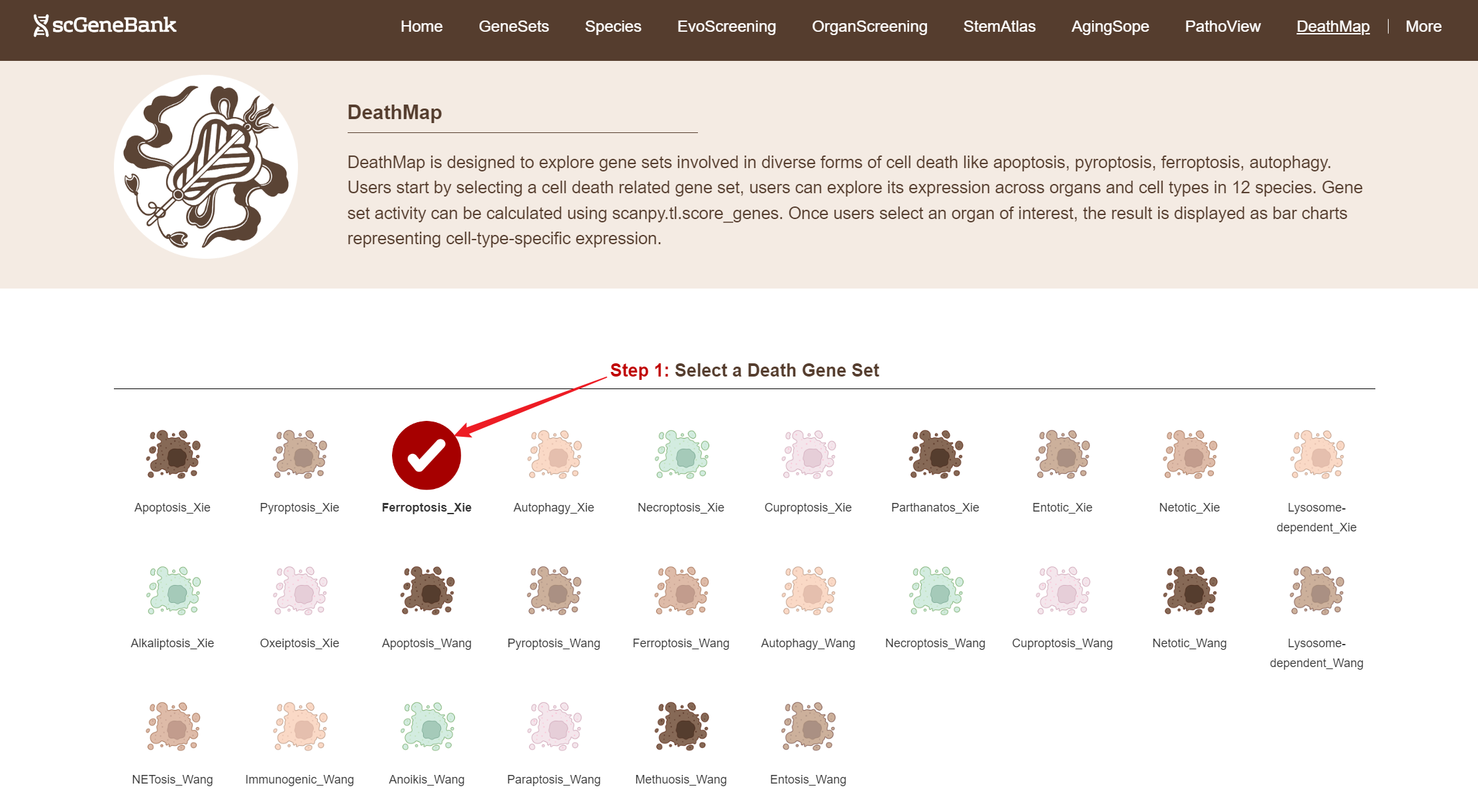 DeathMap is designed to explore gene sets involved in diverse forms of cell death like apoptosis, pyroptosis, ferroptosis, autophagy across whole-body atlas of 12 species at single-cell resolution.